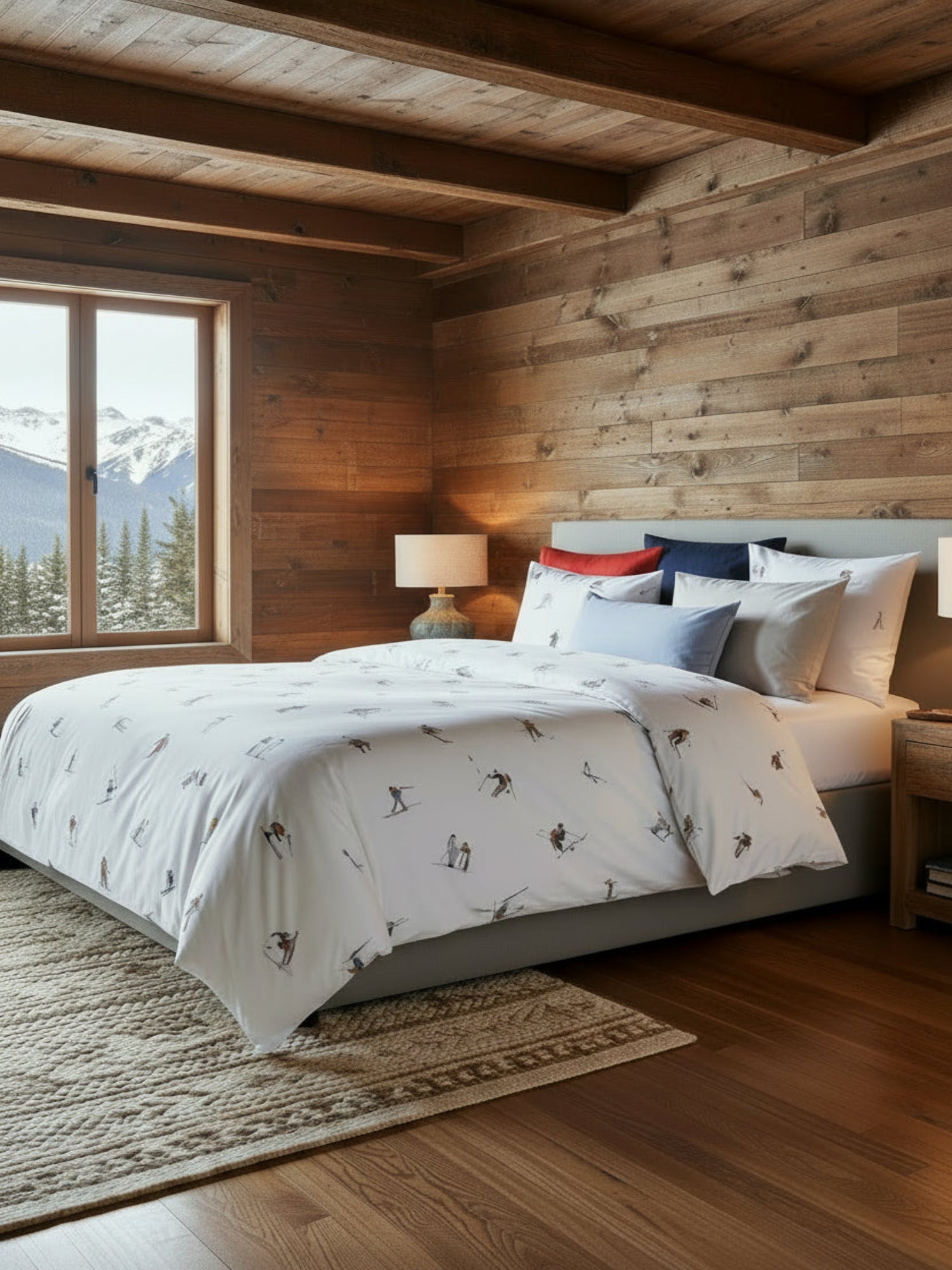 With its ski theme, Engadina portrays a typically Swiss image. The bed linen features winter sports enthusiasts from the 1920s and 30s, alongside skiers of today, some whizzing down the slopes whilst others stand at the side and chat. The detailed drawing of the design, which was originally created using watercolour and photography, beckons the viewer onto the pistes of St. Moritz, the birthplace of the alpine sport at the heart of the Engadin valley. The dynamic motif’s meticulous engraving and brilliant colours are achieved through the intricate 12-stencil print carried out by our long-term Swiss partner.
