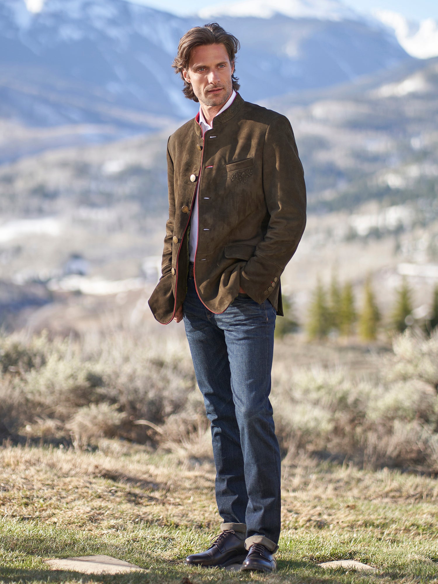 Enjoy traditional German style with the Geigelstein Suede Jacket, designed for cool weather layering. The supple hand of goatskin suede is accentuated by tonal embroidery and red piping, while a stand collar and metal button closure ensure a comfortable fit. Geigelstein's flap hand and welt chest pockets offer classic storage options.