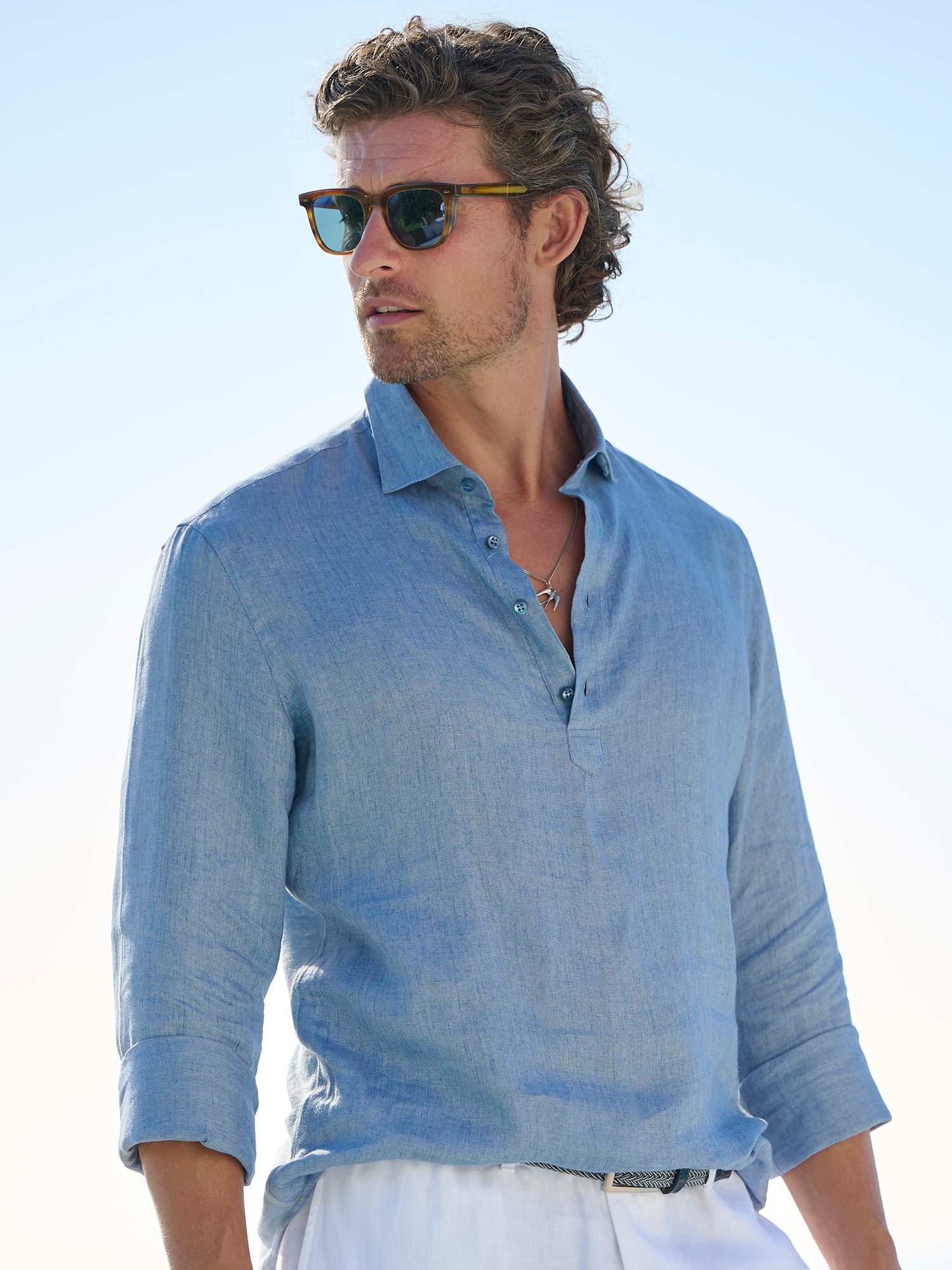 The Linen Jersey Polo Shirt by 100% Capri is a modern take on a classic style. Made in Italy, it features a breathable linen front, a soft jersey back, and tonal mother-of-pearl buttons for understated refinement. Perfect for effortless comfort and style in warm weather.
