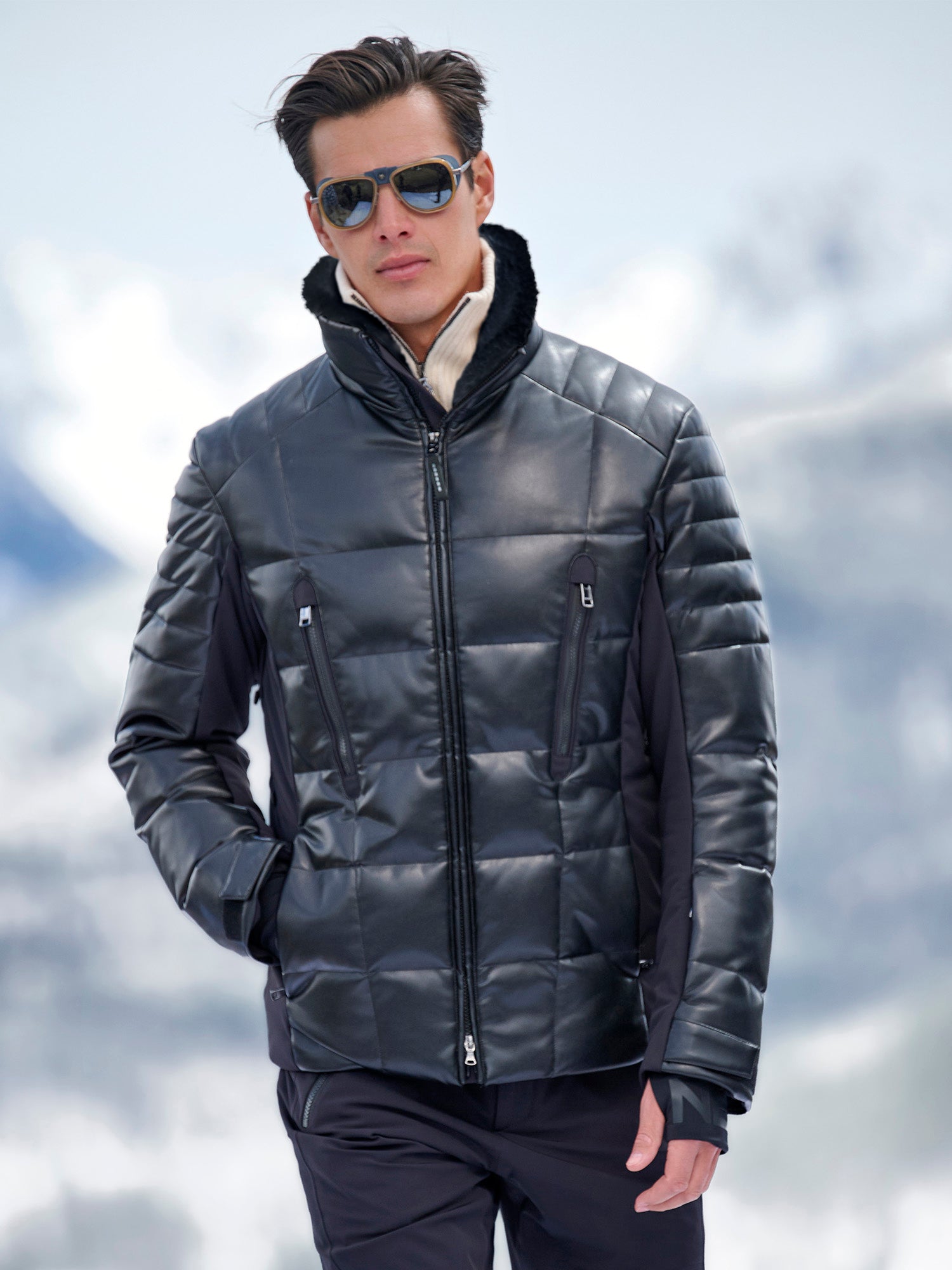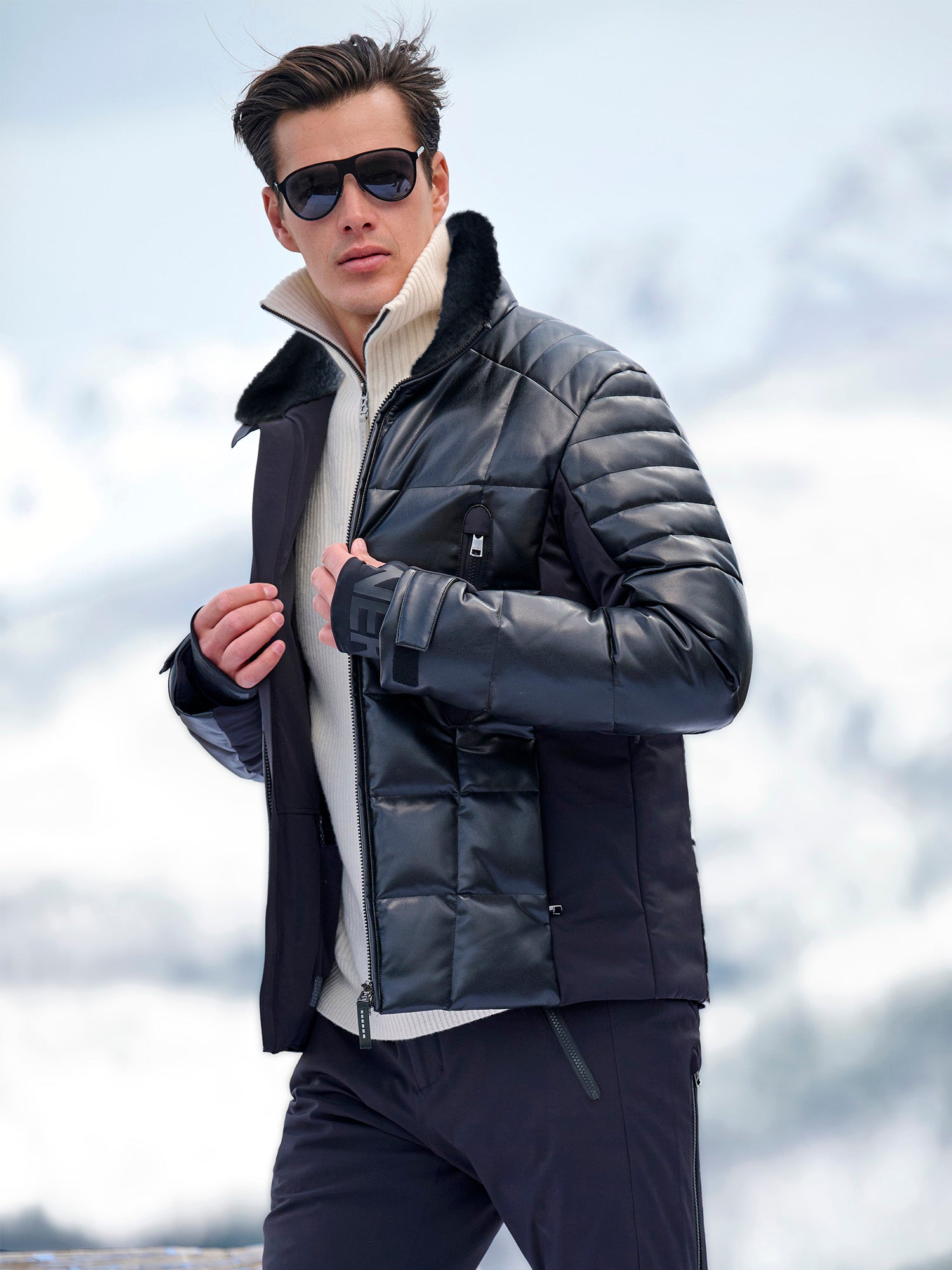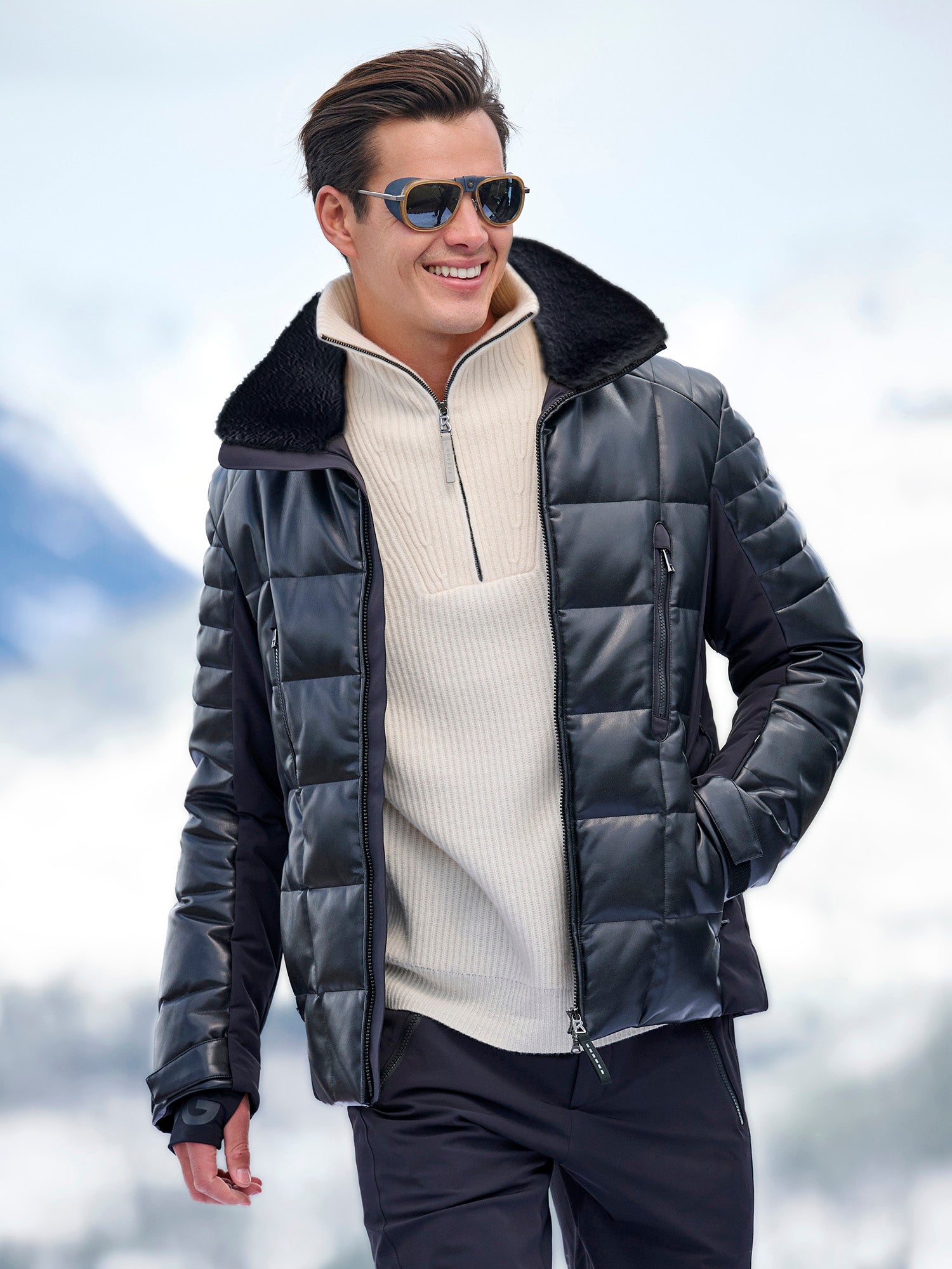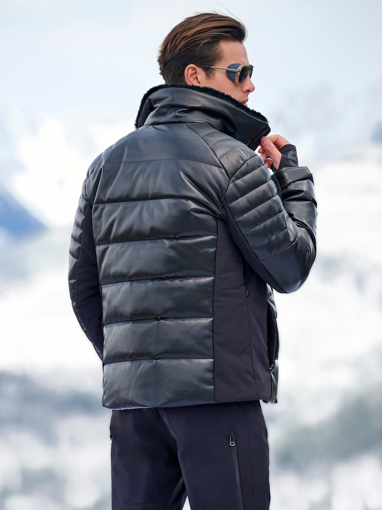 Built for performance and styled with edge, the Calem Sport Leather Ski Jacket by Bogner delivers a modern take on alpine luxury. Crafted from matte faux sport leather with flexible four-way stretch panels, it moves effortlessly while offering the structure and presence of a classic bomber. Down insulation and a teddy-lined stand collar provide warmth and comfort, while technical features like a powder skirt, jersey cuffs, and ample pockets ensure you're ready for the mountain. Whether layered over ski gear or styled for town, this jacket makes a confident and effortlessly cool statement.