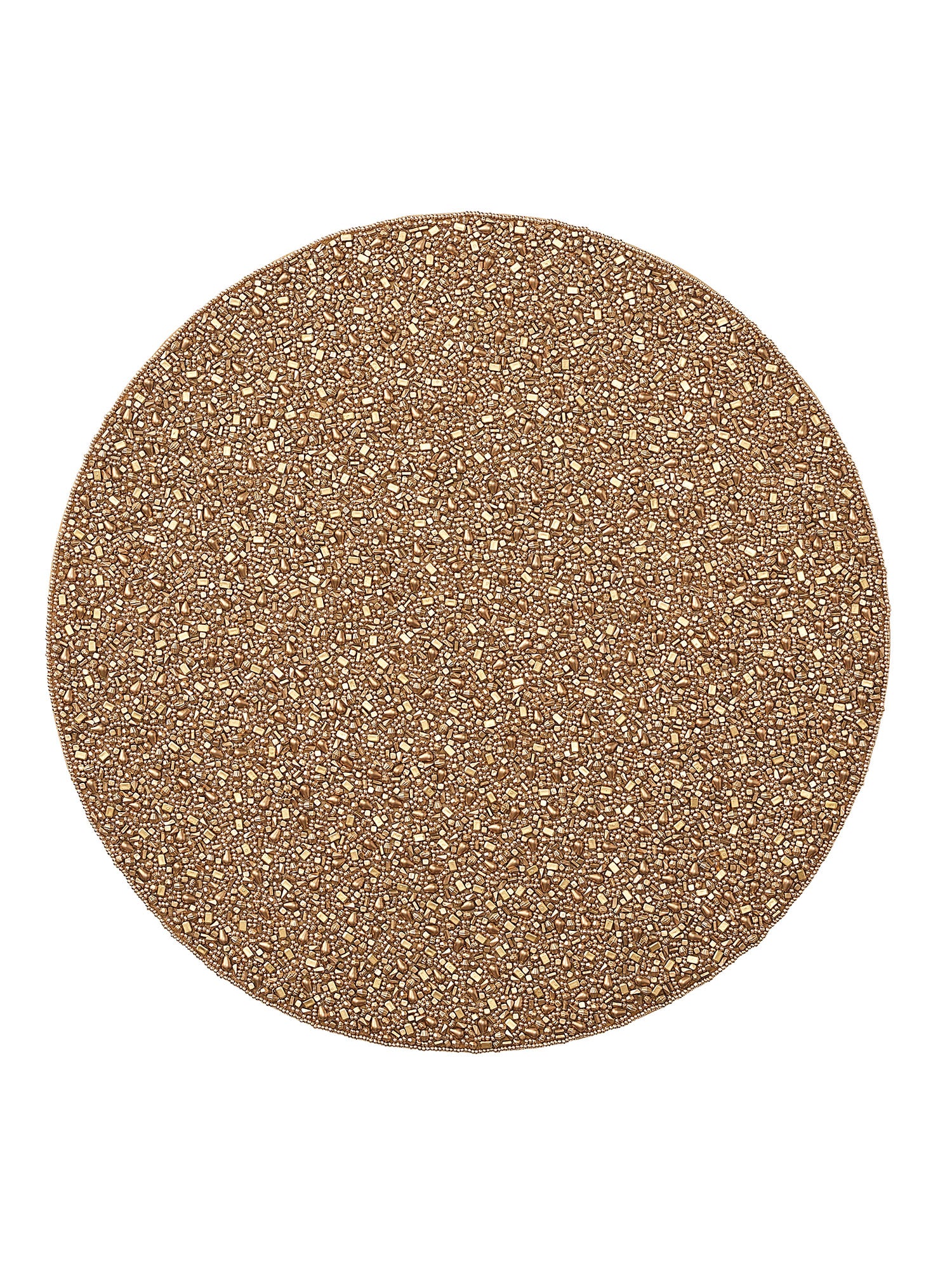 The textured, beaded Gold Rush Placemat is created with a variety of matte, multi-shaped gold beads, resulting in a "pebbled" appearance. It features a subtle matte shimmer making the placemat both glitzy and modern. It is the perfect base for a formal tablescape or a holiday gathering.