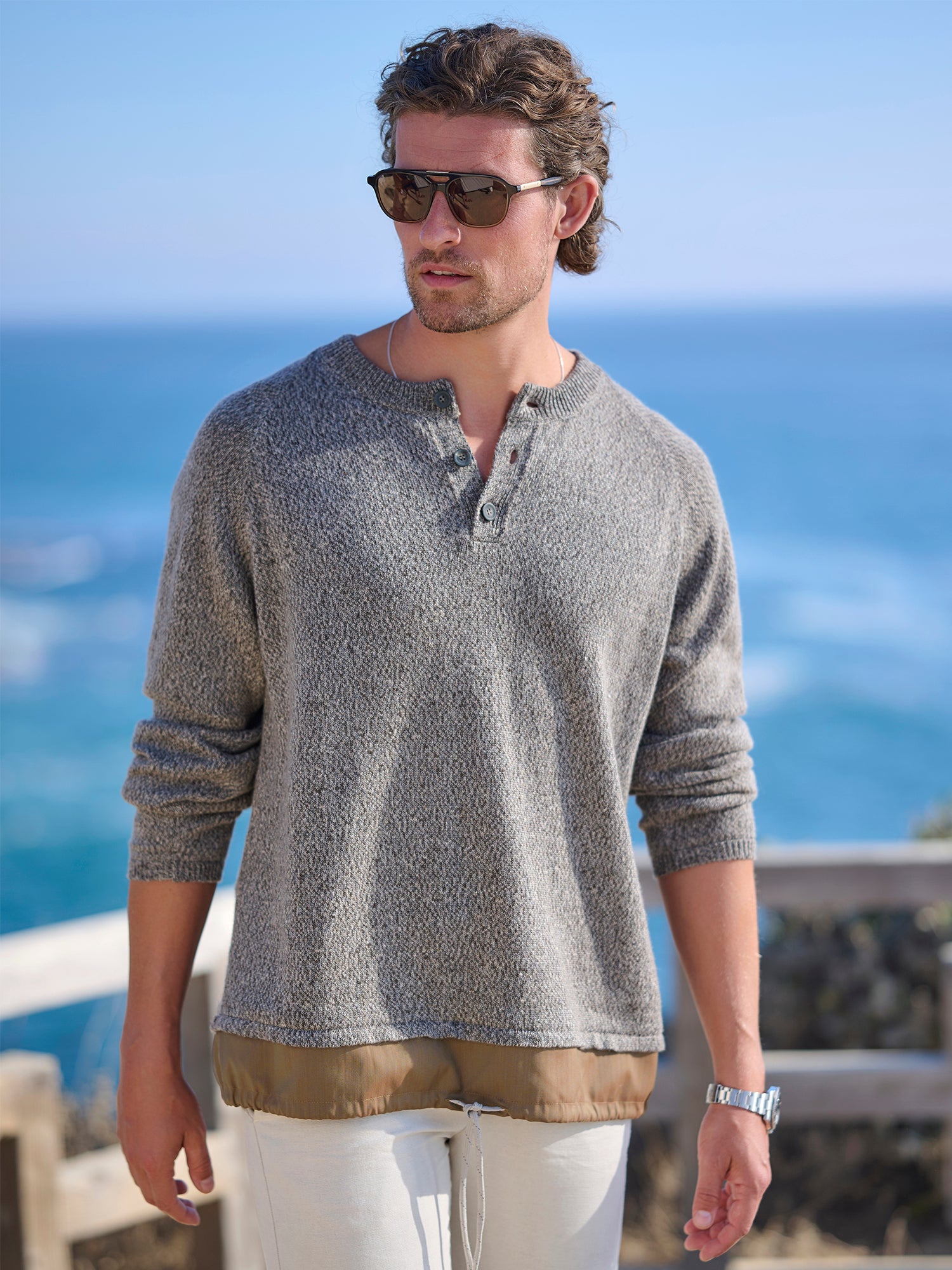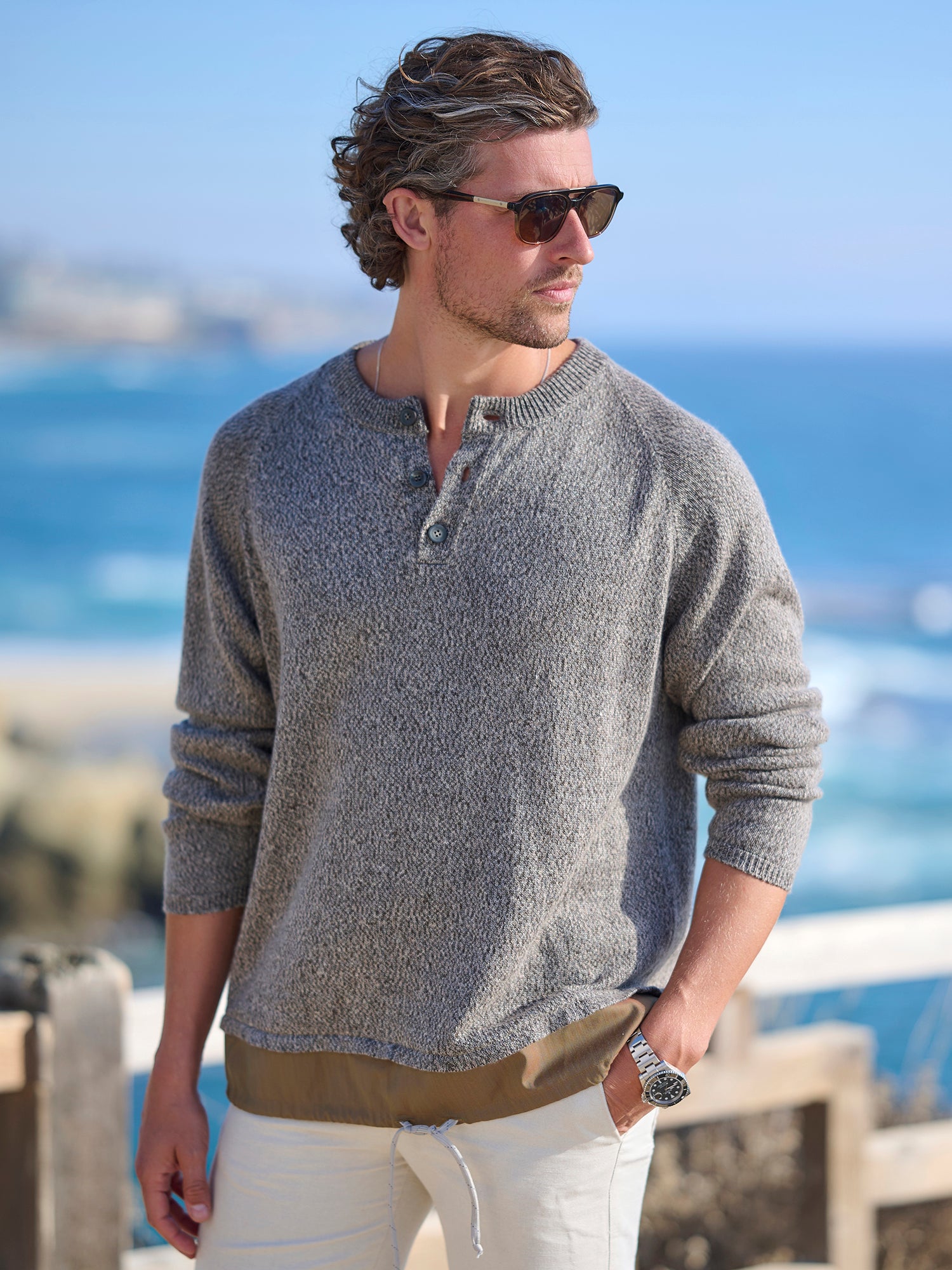 Introducing the Mouline Henley Sweater by Sease. Made in Italy, this linen cashmere blend sweater features a serafina buttoned neck, drawcord hem, and ribbed cuffs. Create a cool and casual look with this everyday sweater.
