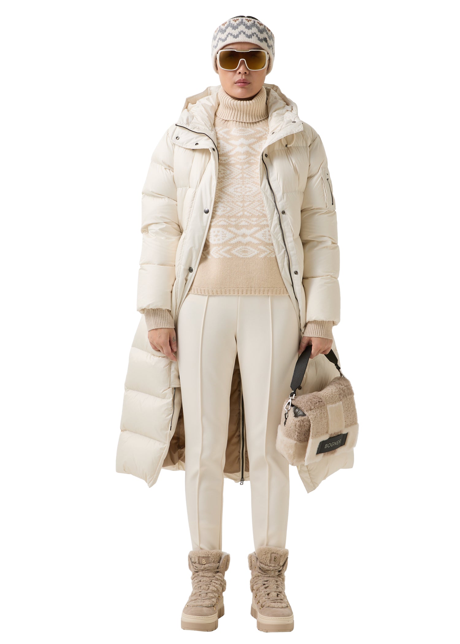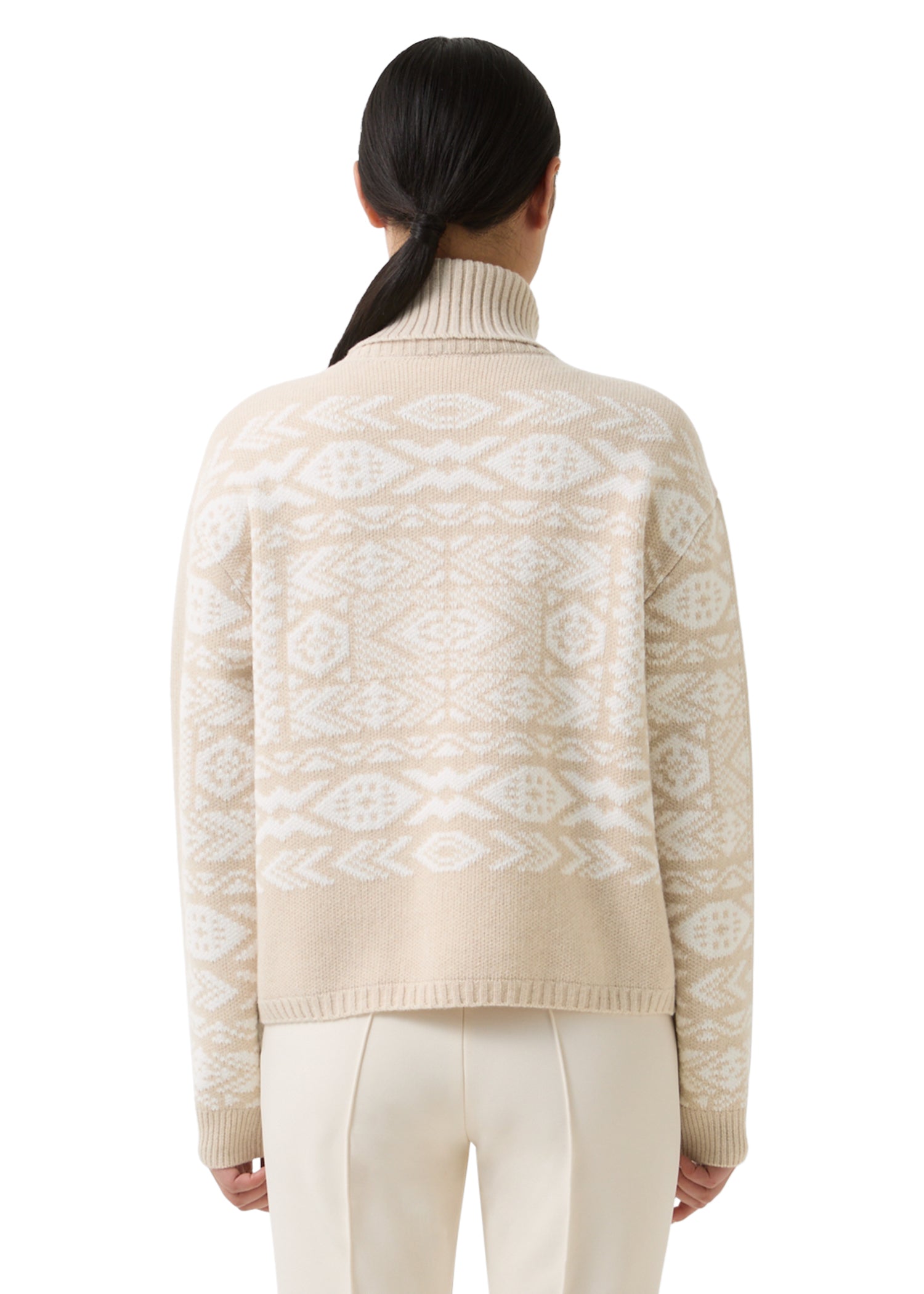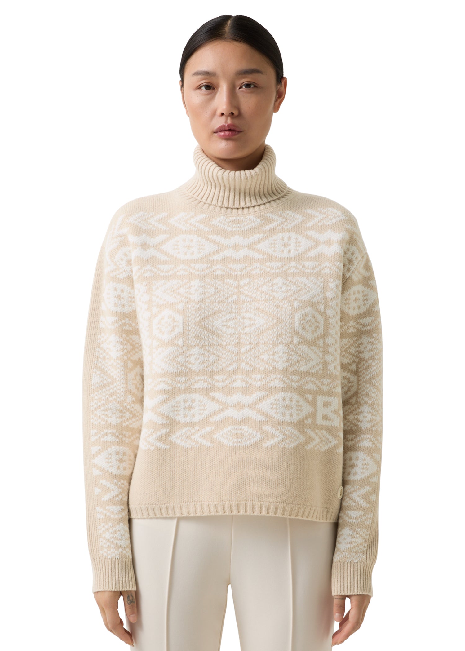 A modern nod to classic Nordic design, the Nadin Sweater from Bogner combines heritage-inspired patterning with effortless sophistication. Knit from extra-fine merino wool, this cozy turtleneck offers lightweight warmth and a soft, breathable feel. Its foldover ribbed collar, hem, and cuffs frame a relaxed, yet flattering silhouette, while the allover jacquard motif lends a graphic, alpine touch. Finished with subtle logo detailing, the Nadin Sweater transitions seamlessly from winter days on the mountain to evenings by the fire.