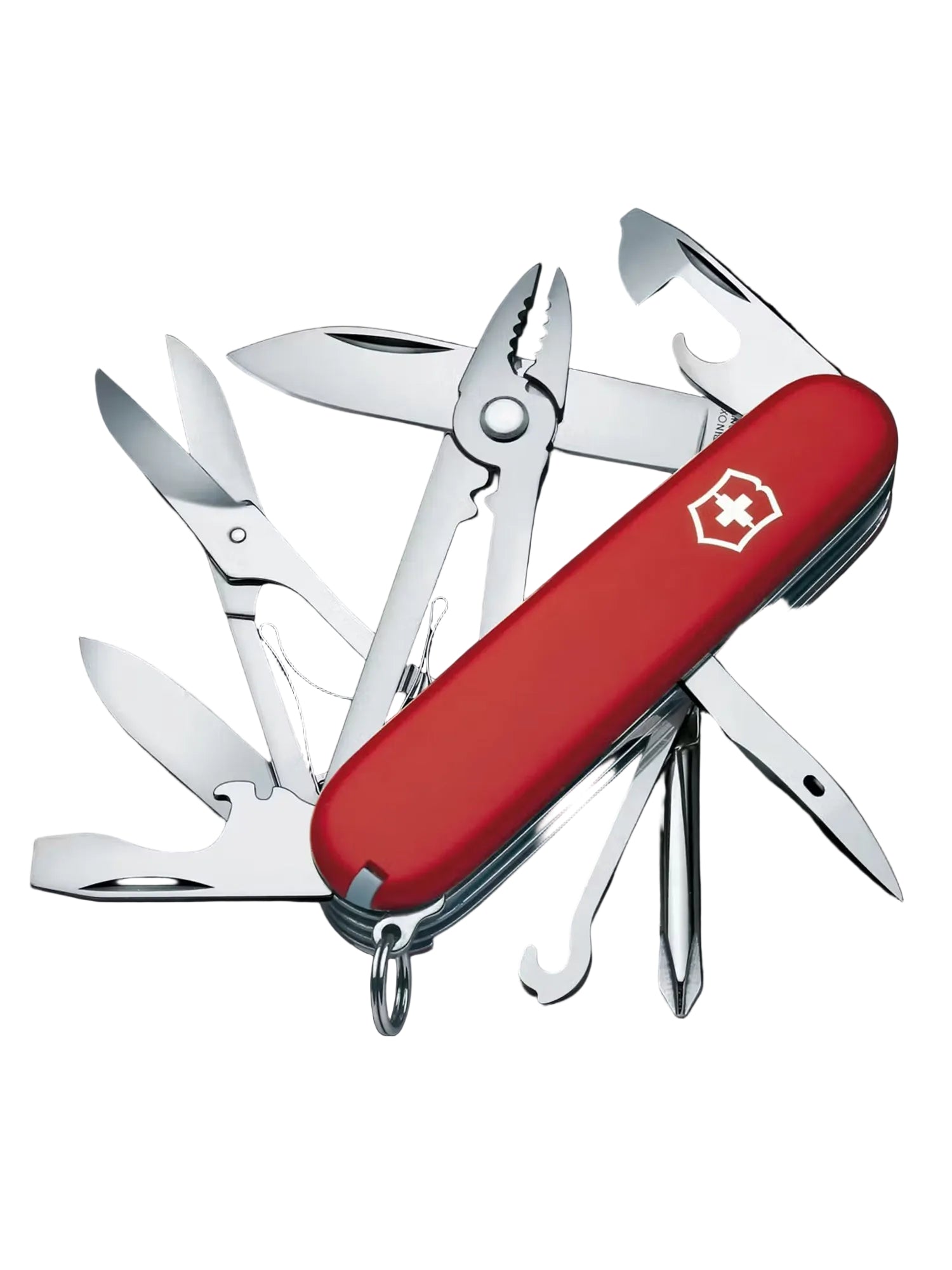 • 17 tools: large blade, small blade, key ring, tweezers, toothpick, can opener, bottle opener, wire stripper, wood saw, 3mm screwdriver, 6mm screwdriver, reamer punch and sewing awl, scissors, phillips screwdriver 1/2, multipurpose hook, combination pliers, wire crimper