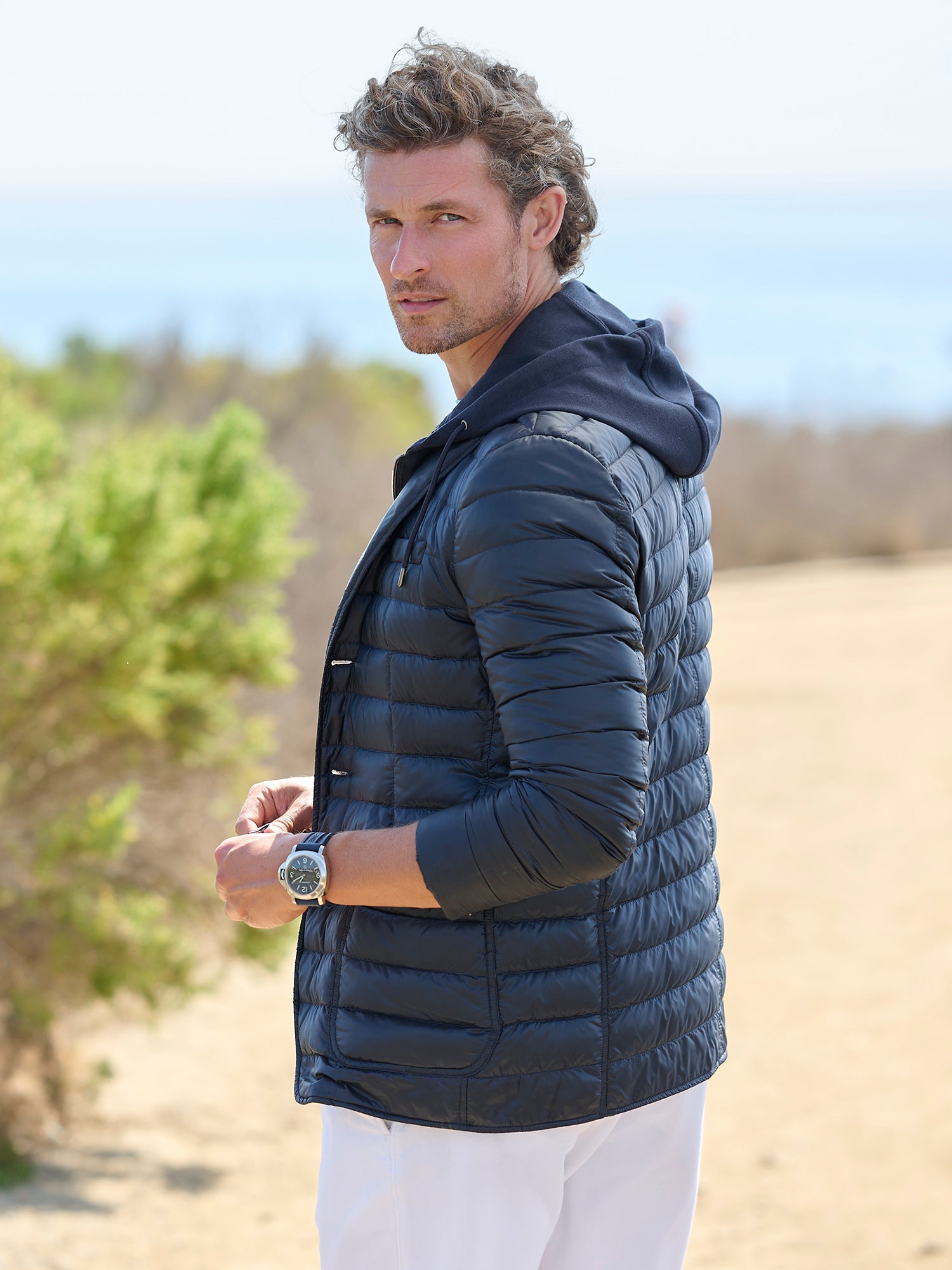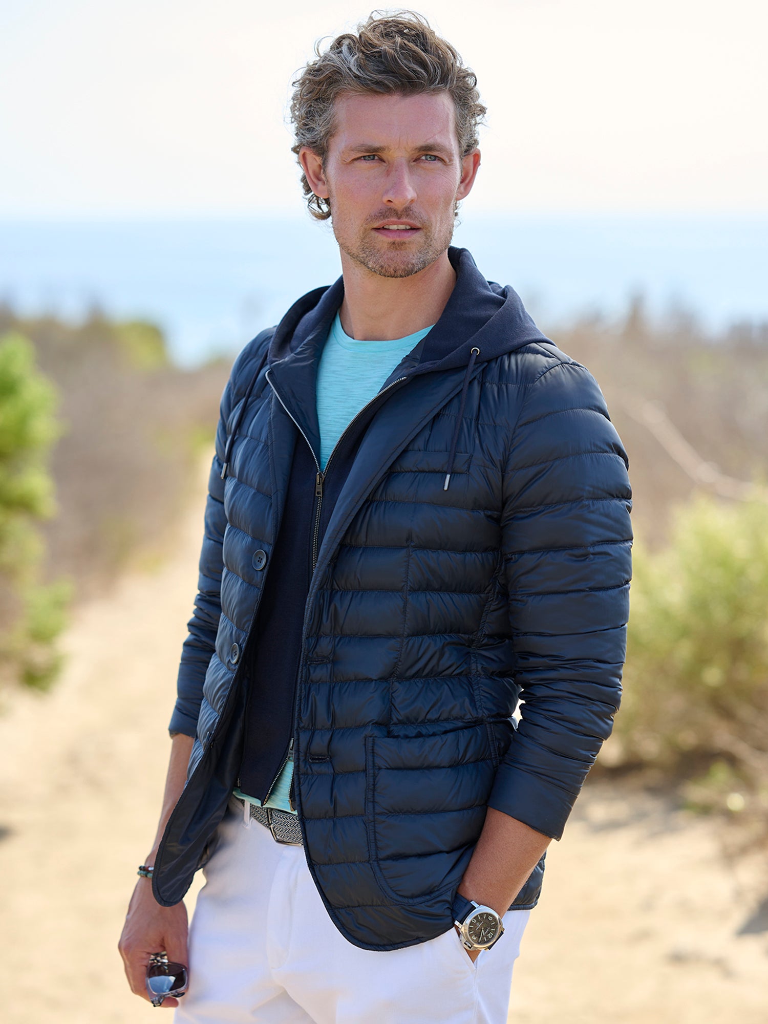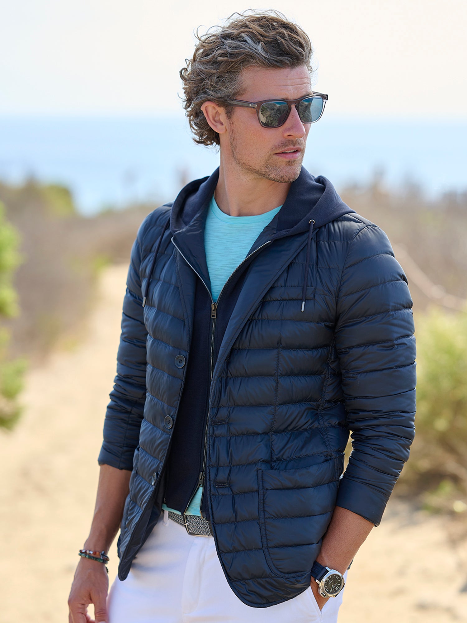 Elevate your wardrobe with the Carlo Ultralight Down Blazer, exclusively available at Gorsuch. Made in Italy from iconic Herno nylon, this blazer features lightweight down insulation and a detachable tonal fleece wind guard with a hood. Perfect for any season, it's a must-have bestseller for a sophisticated look.