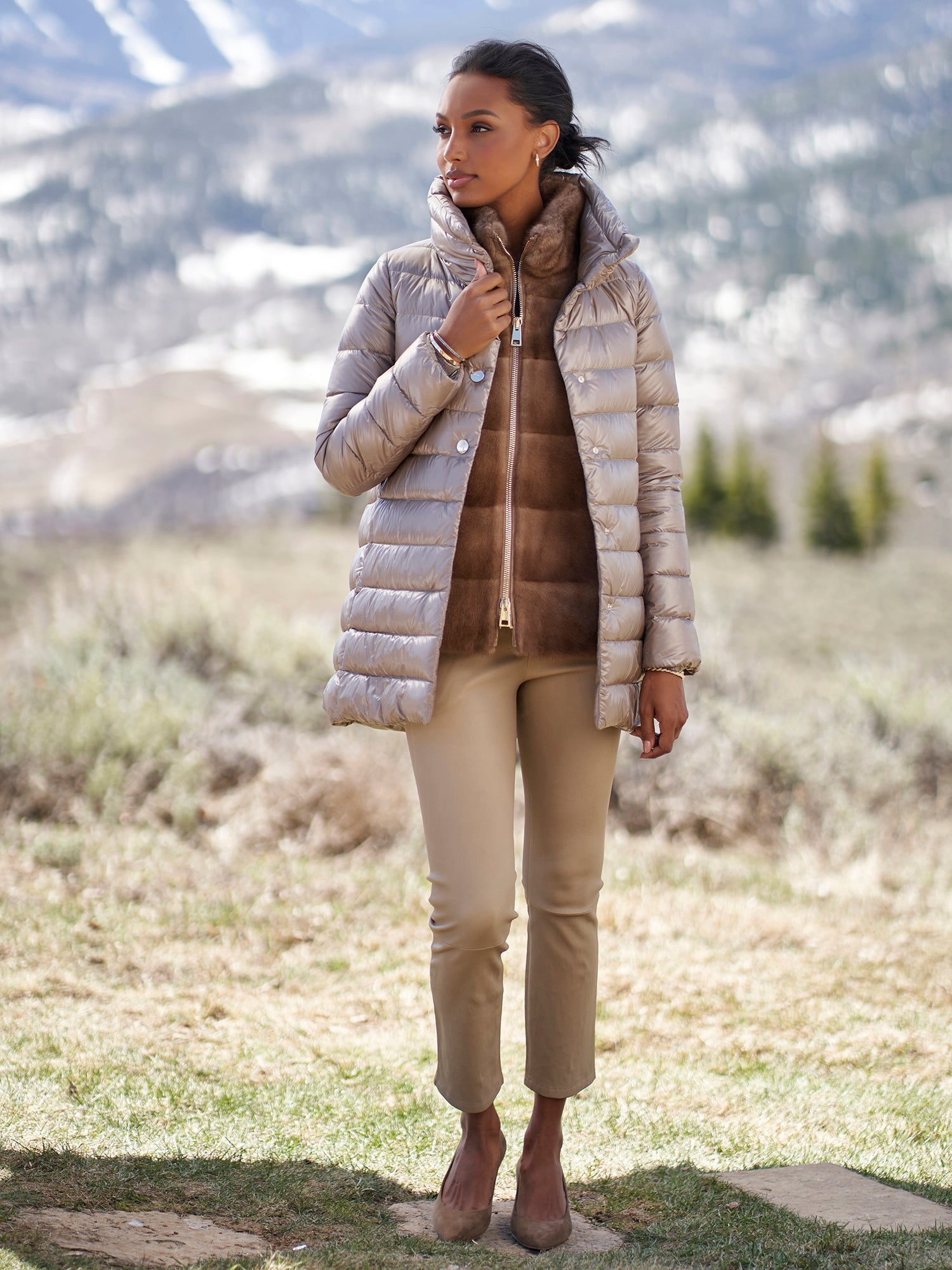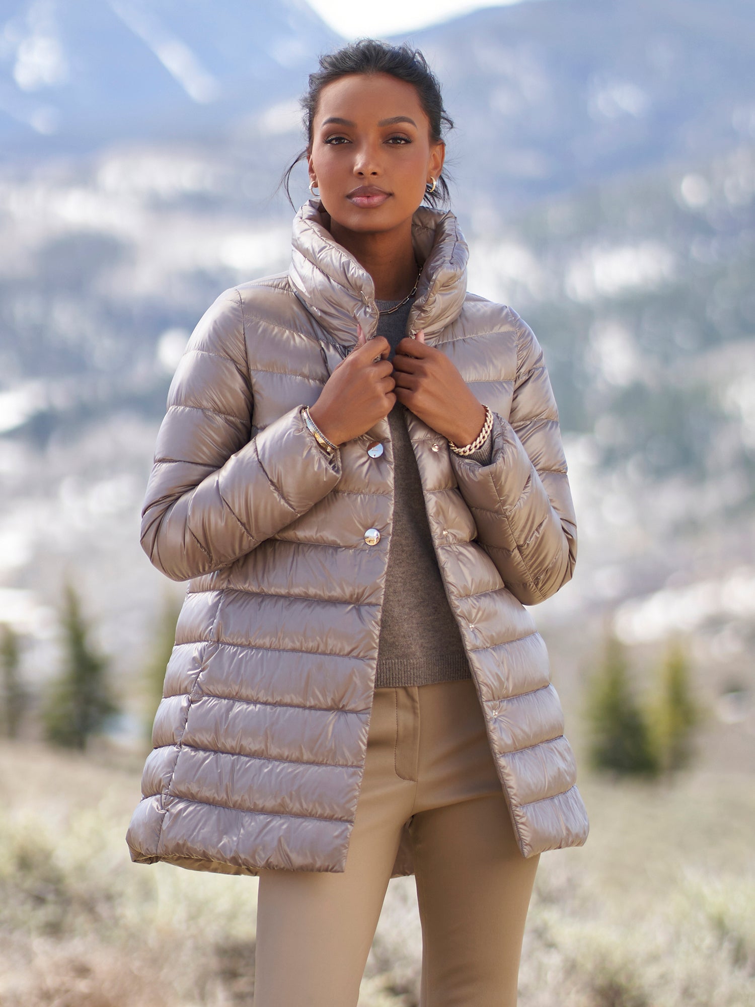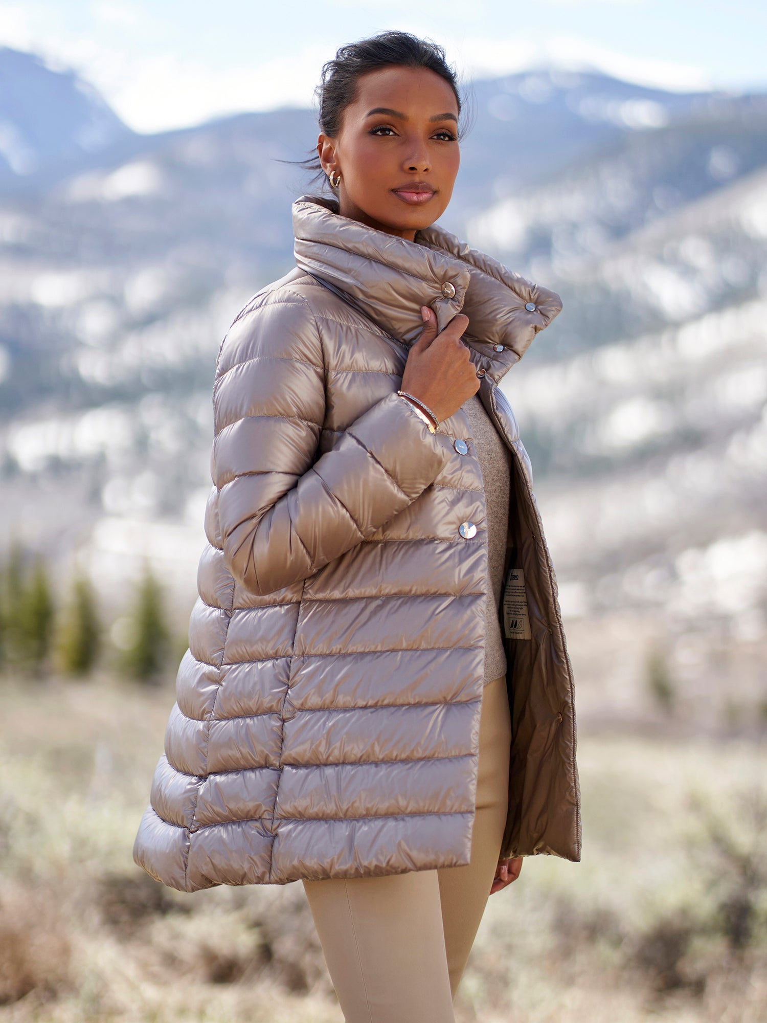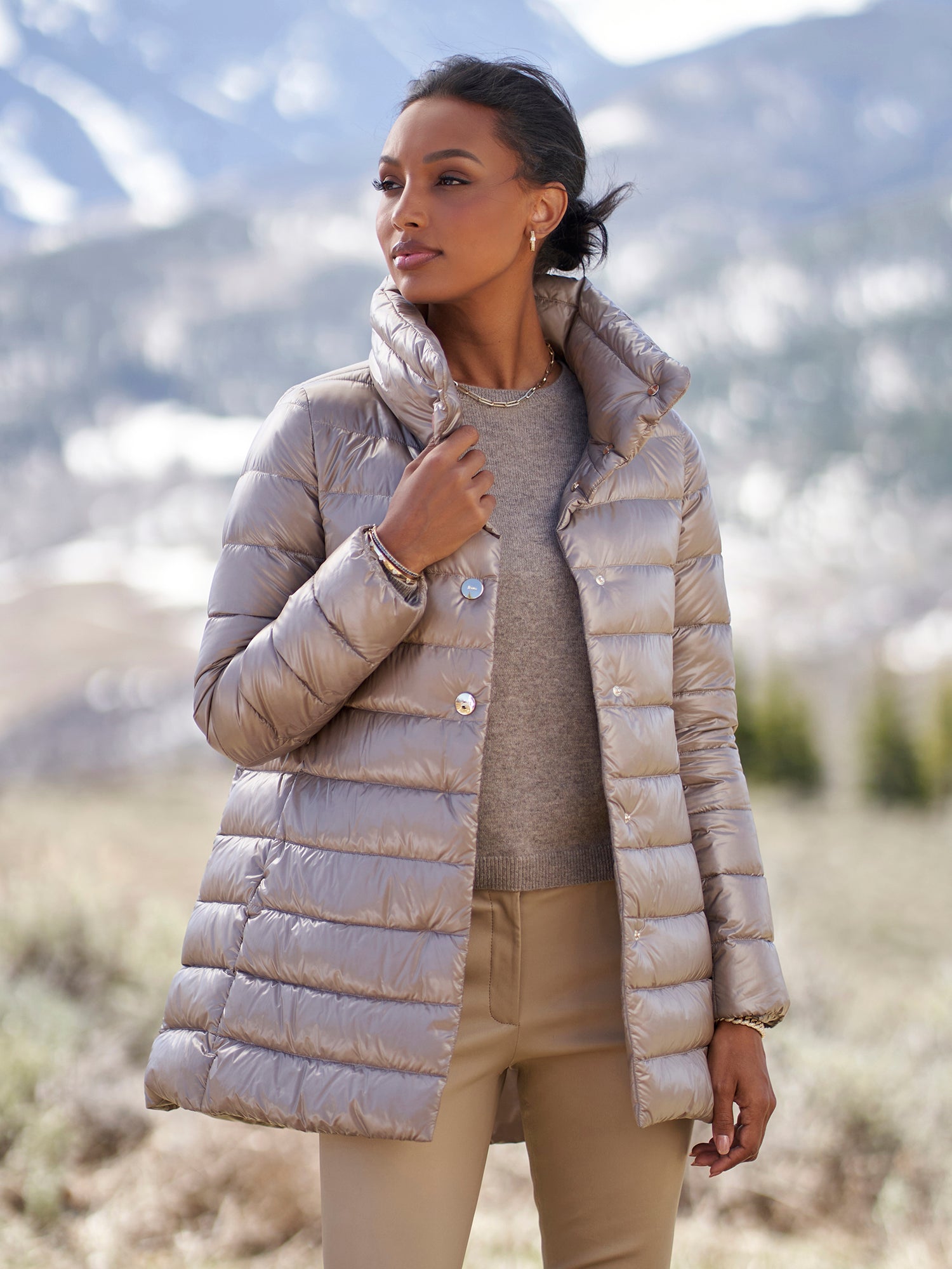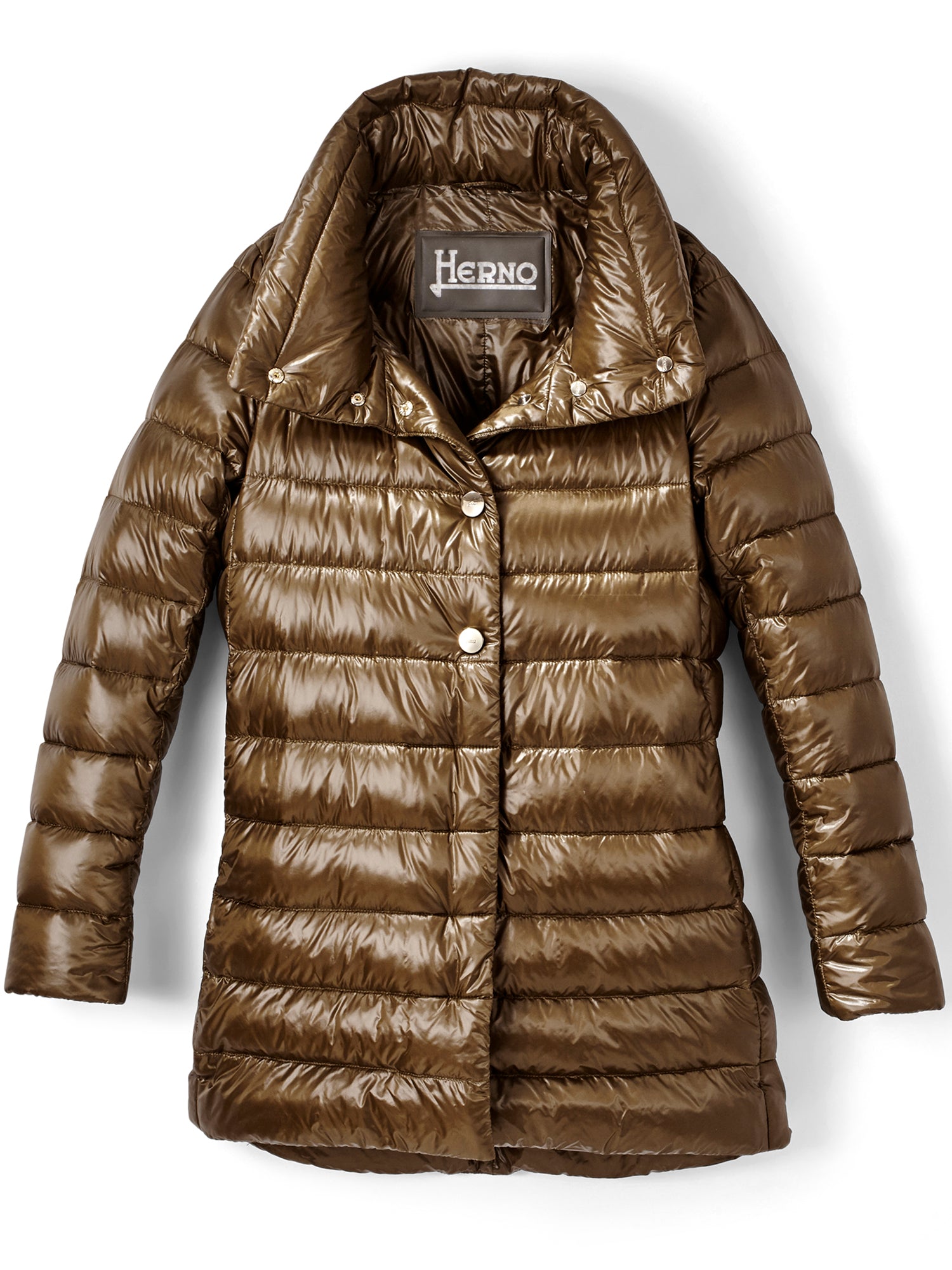 A Gorsuch best-seller, this modern coat with a smart a-line will keep you warm all winter long. A high neckline and gold snap closures make this coat chic and luxurious. Herno's ultralight down is fashionable, warm, and perfect for travel.