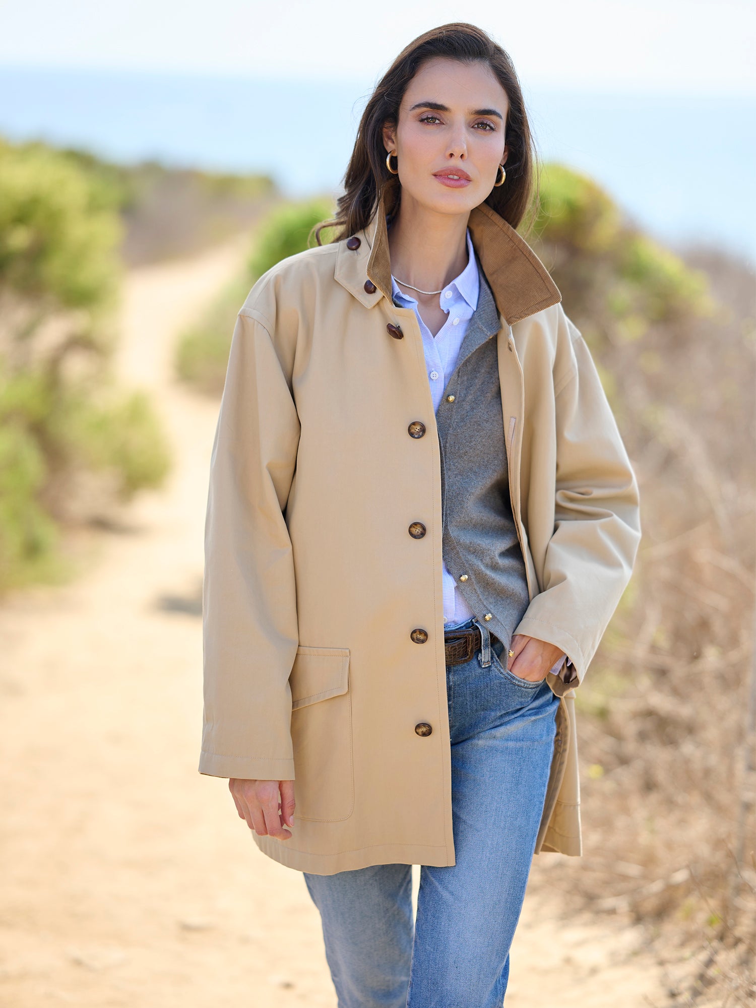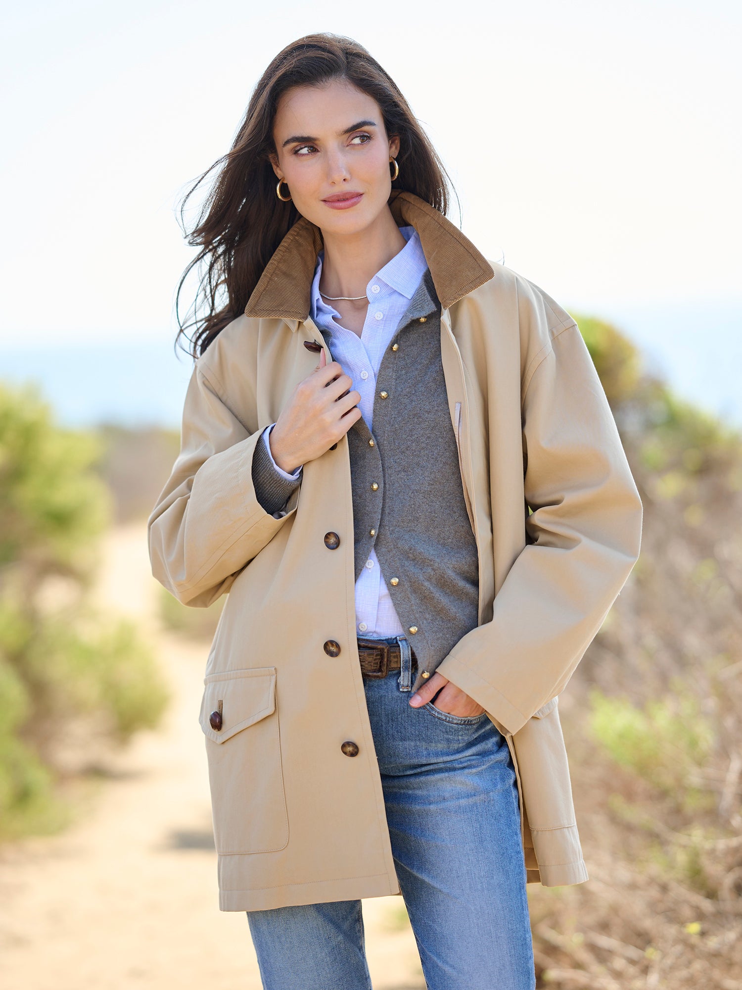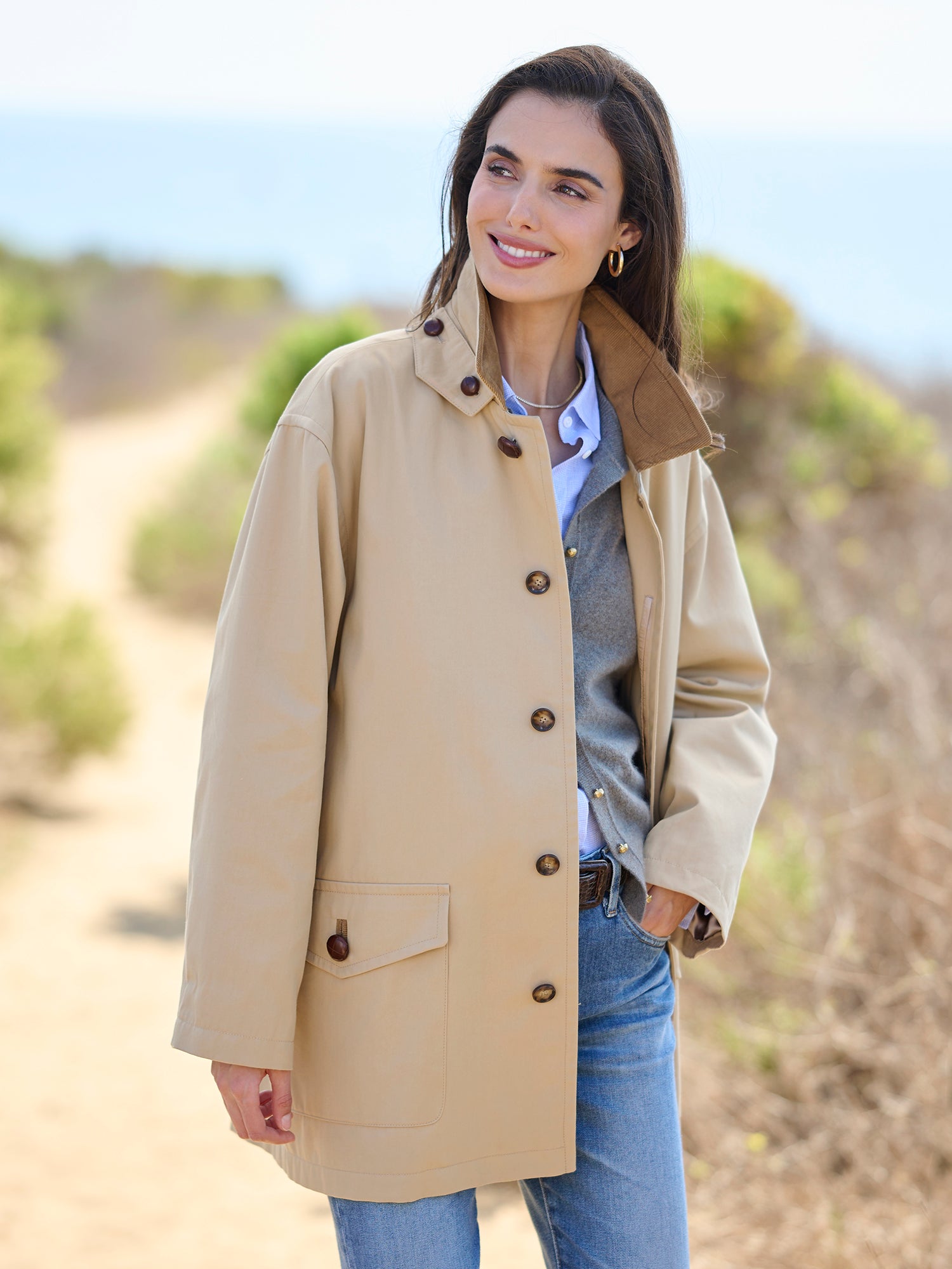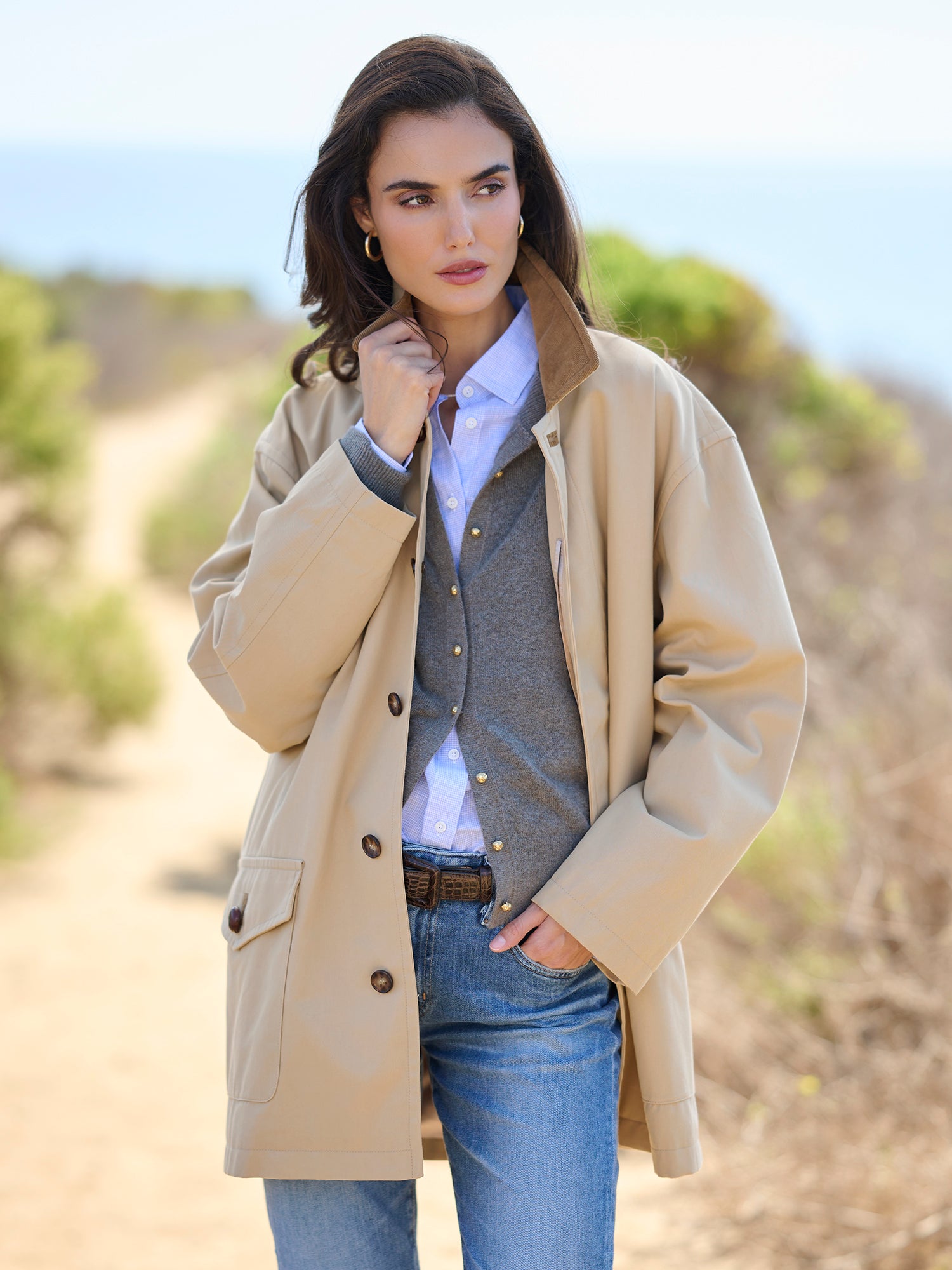 The Billie Barn Coat is an ideal choice for chilly spring days. Made in Germany, this lightweight cotton coat combines functional design with timeless style. A contrasting corduroy collar lends vintage charm, while the satin lining and leather buttons add a touch of sophistication.