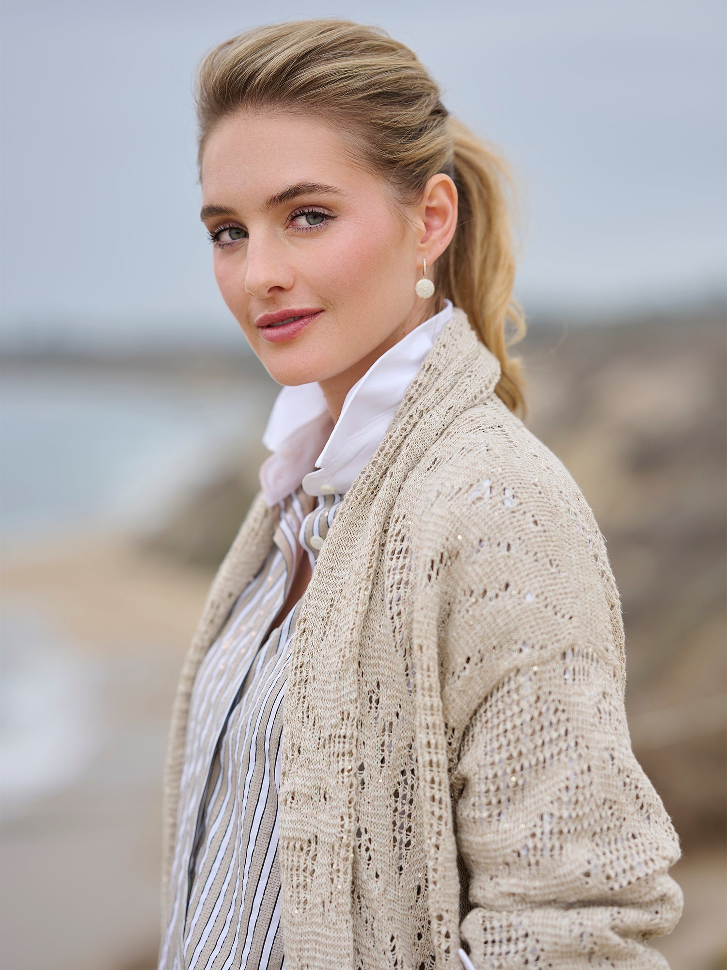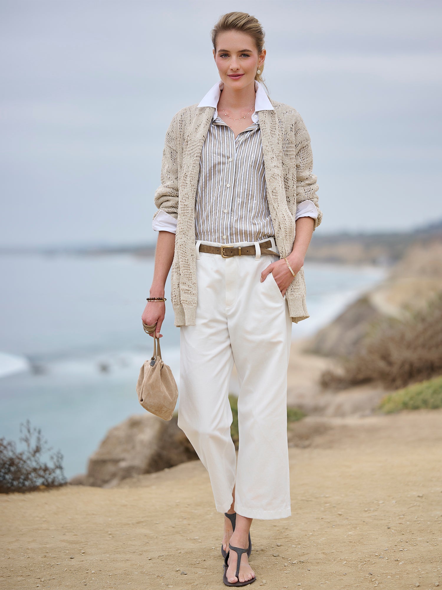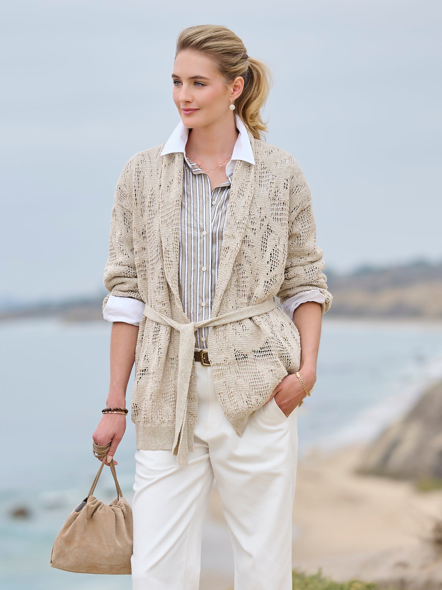 Softly textured and effortlessly refined, the Embroidered Crochet Shawl Cardigan embodies Brunello Cucinelli’s understated approach to luxury. Its detailed crochet knit and subtle embroidered accents create a light, elegant layer that adds dimension and quiet sophistication to spring dressing.