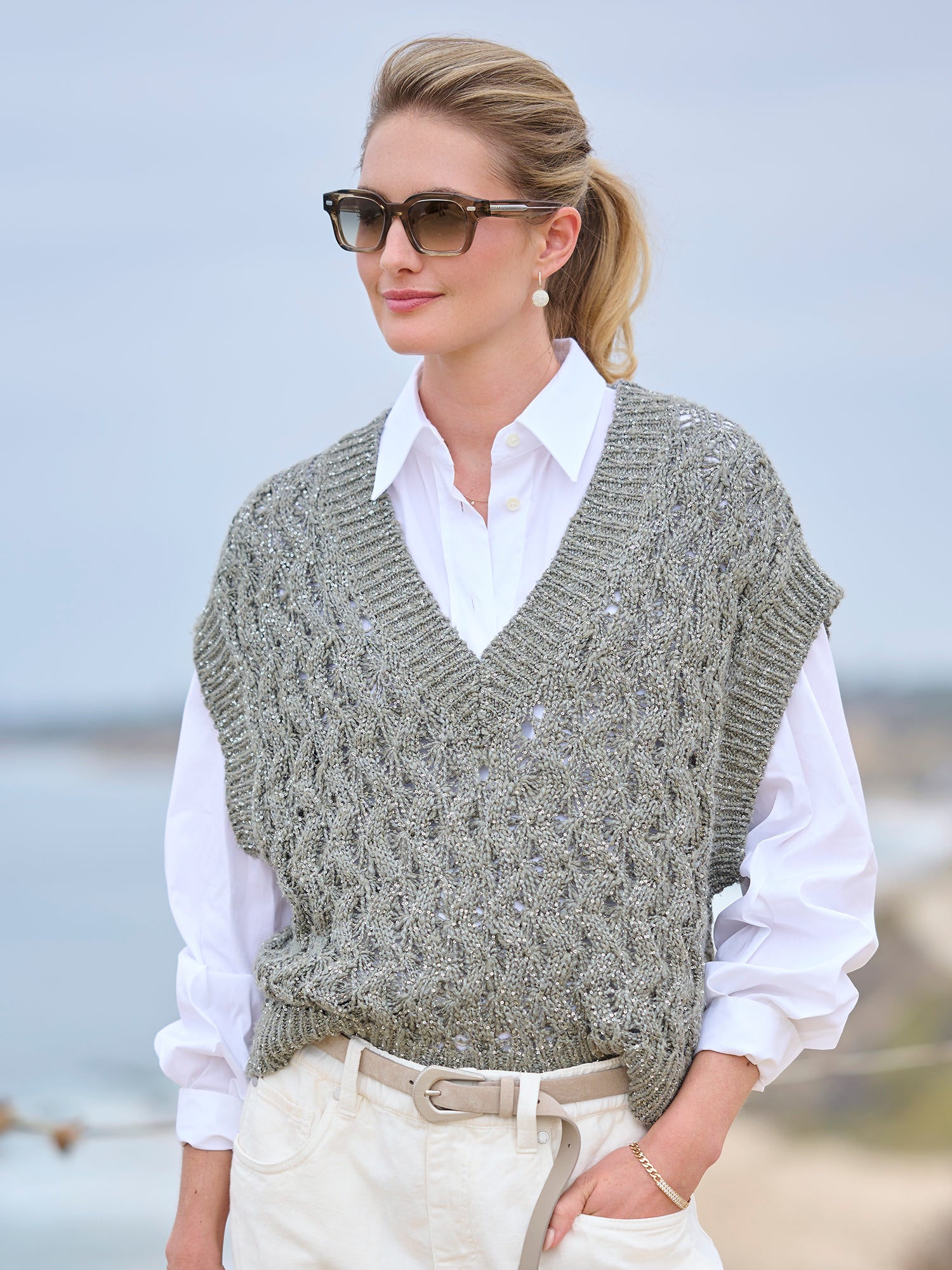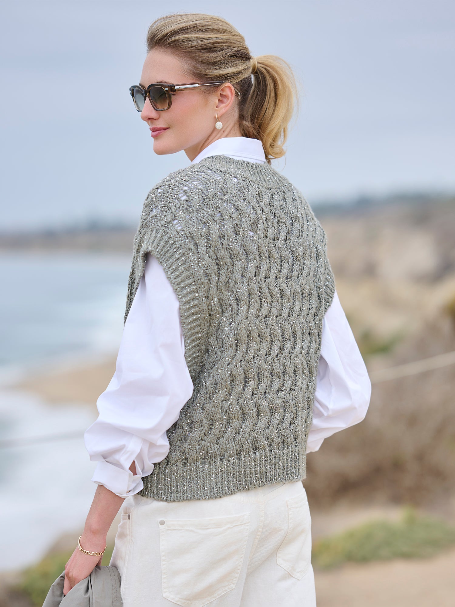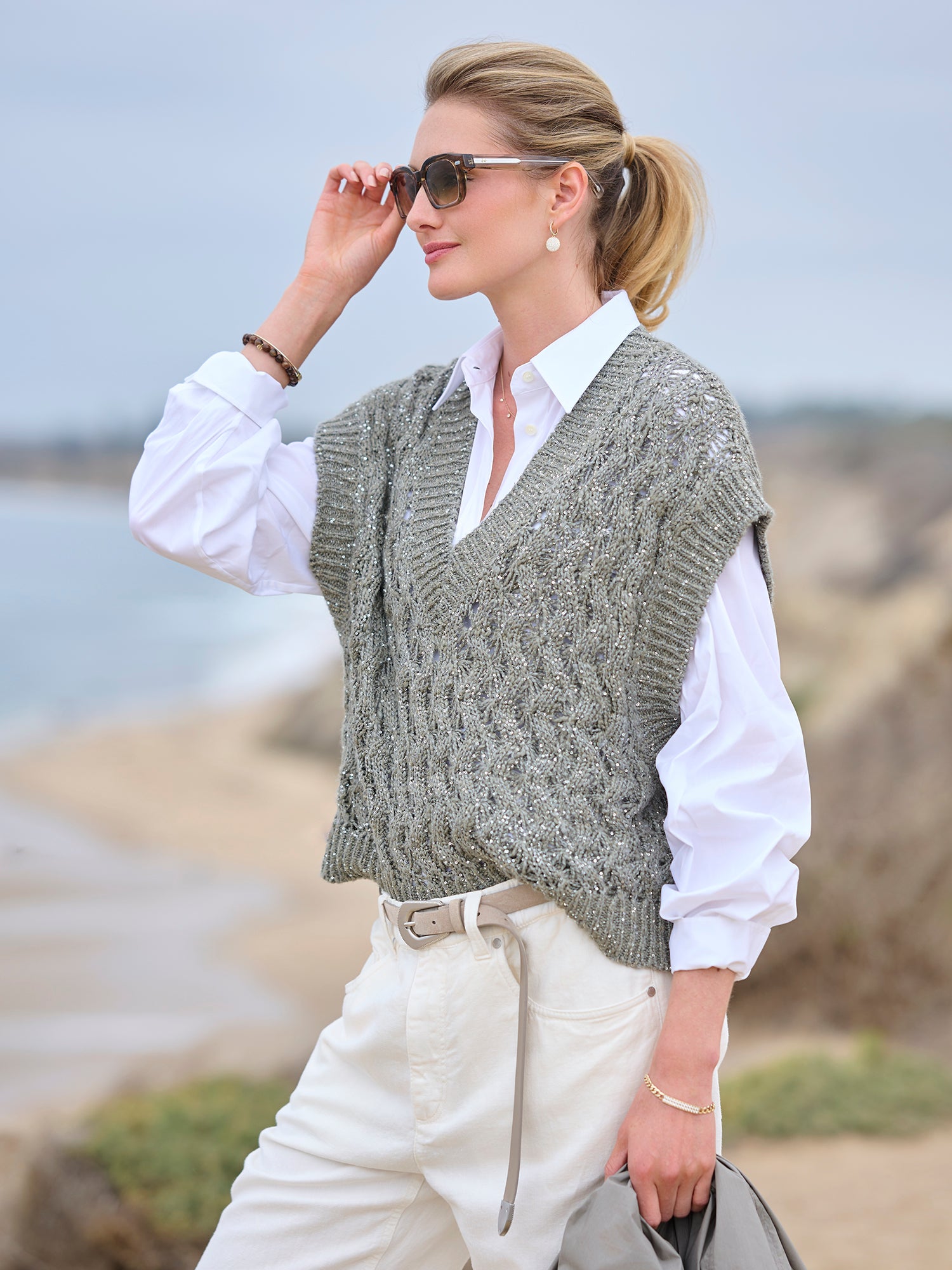 Made in a soft open-cable stitch subtly threaded with paillettes that catch the light, the Paillette Cable Knit Vest is an easy V-neck layer that balances relaxed ease with refined sophistication. A modern interpretation of knitwear, it embodies Brunello Cucinelli’s signature subtle elegance for the spring season.