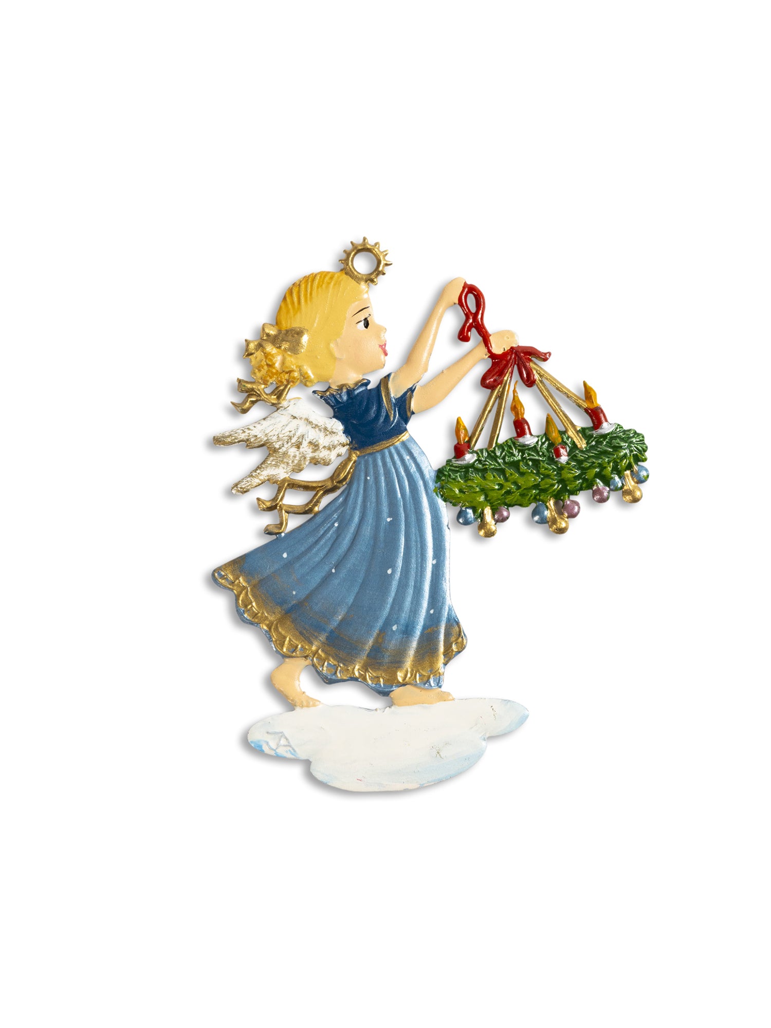 Angel Carrying Christmas Wreath Ornament by Wilhelm Schweizer is hand cast, hand painted, and made of imported pewter from Germany.