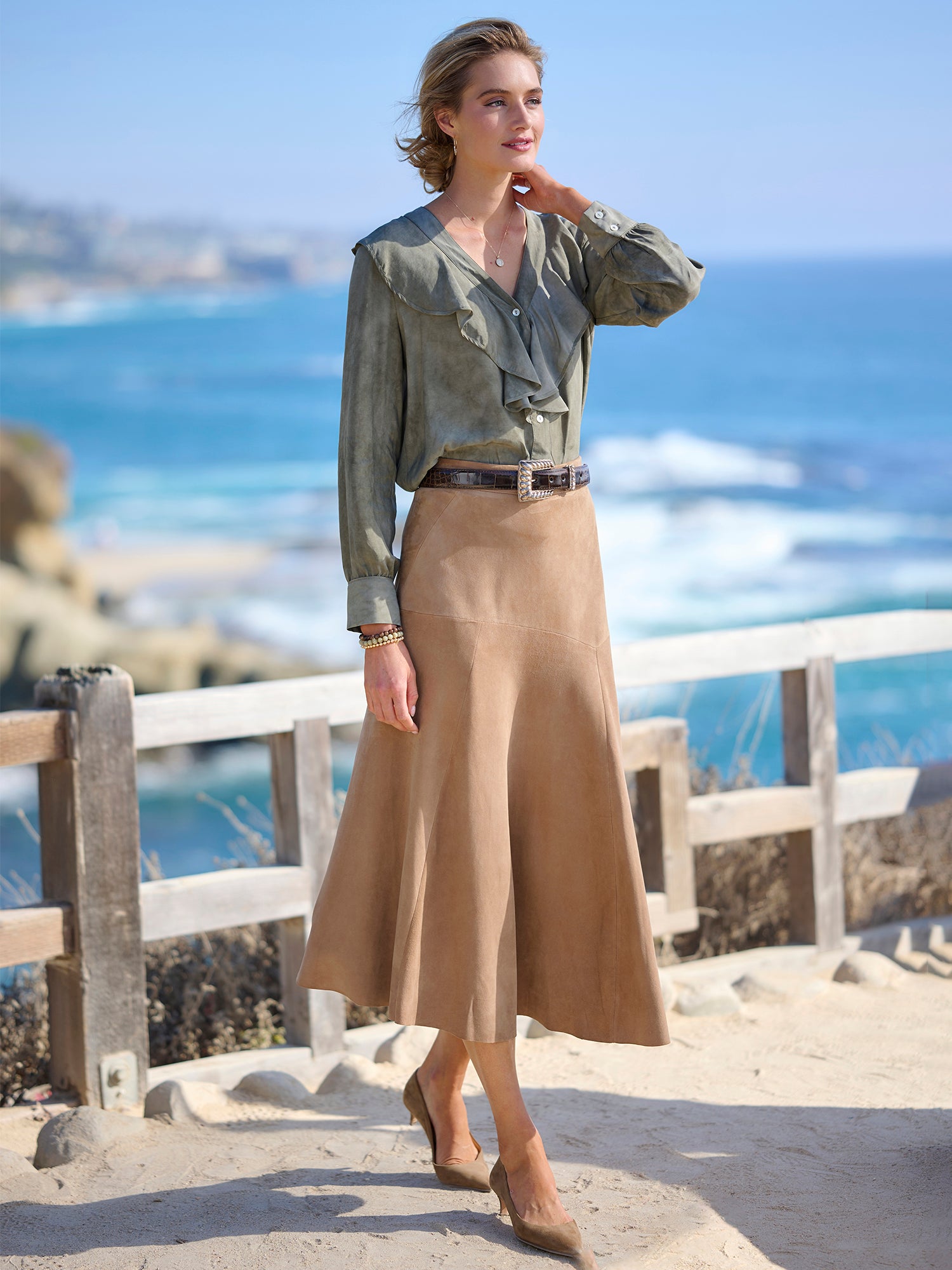 Crafted with high-quality suede in Italy, the Delia Suede Skirt boasts an asymmetrical fit and flare shape that is both elegant and flattering. This neutral suede skirt is a luxurious staple piece in any closet.