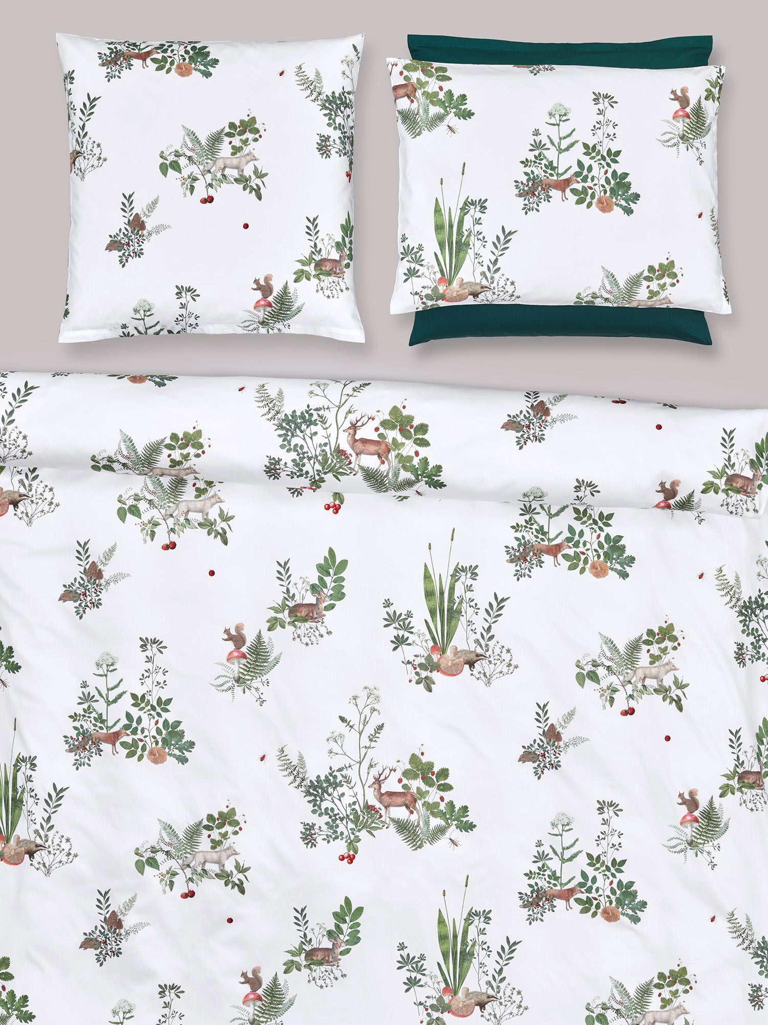 The playful motif of the magical Forest bed linen looks like it came from the fairytale stories of the Brothers Grimm. Deer, roe deer and badgers have retreated peacefully between the delicate bushes and delicate red berries. The motif is presented on a beautiful white satin and makes every bedroom shine with new splendor.