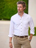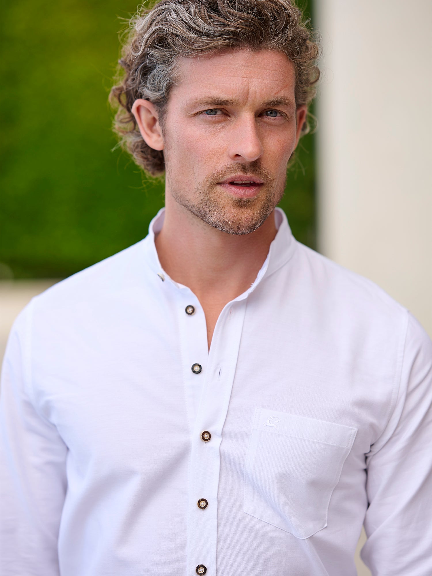 Clean lines meet alpine tradition in the Hans Horn Button Shirt. Made in Austria from crisp cotton, this tailored style features a refined band collar and signature stag horn buttons for a rustic yet sophisticated edge. A chest pocket with a subtle embroidered stag adds a quietly distinctive finish—effortlessly versatile and refined.