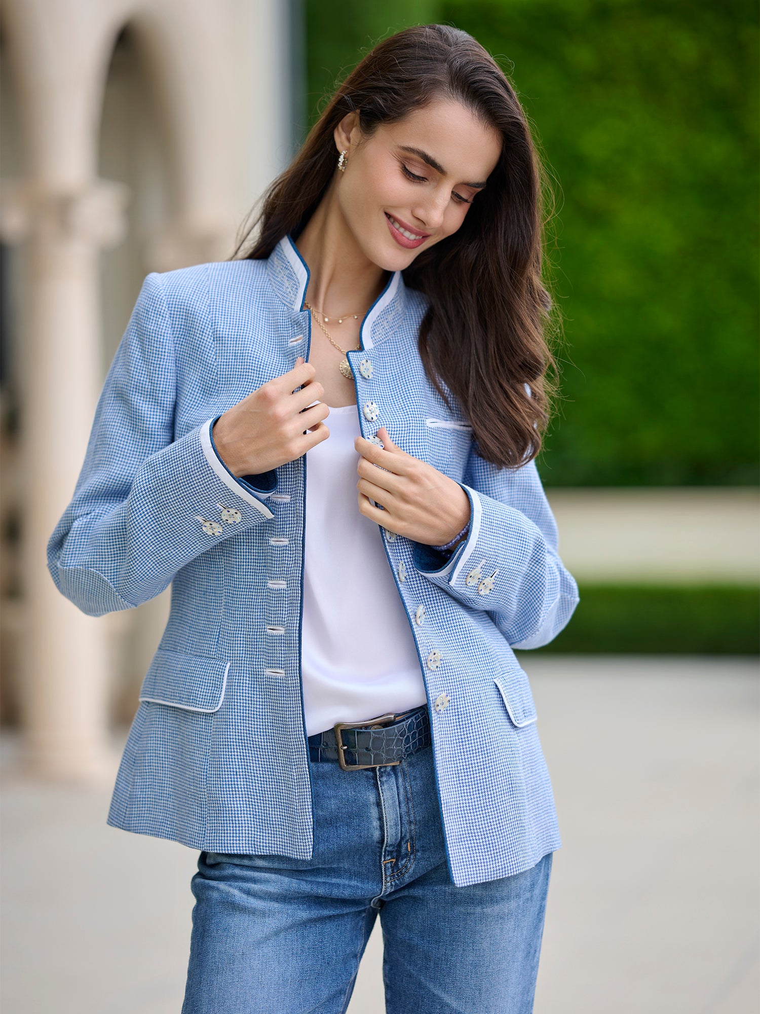 Expertly made in Austria, the Katharina Linen Jacket is a gorgeous addition to your spring wardrobe. This light jacket features contrast piping on the collar and cuffs, delicate embroidery details, and a front crystal button closure. Katharina also has three pockets and a back pleat with a belt.