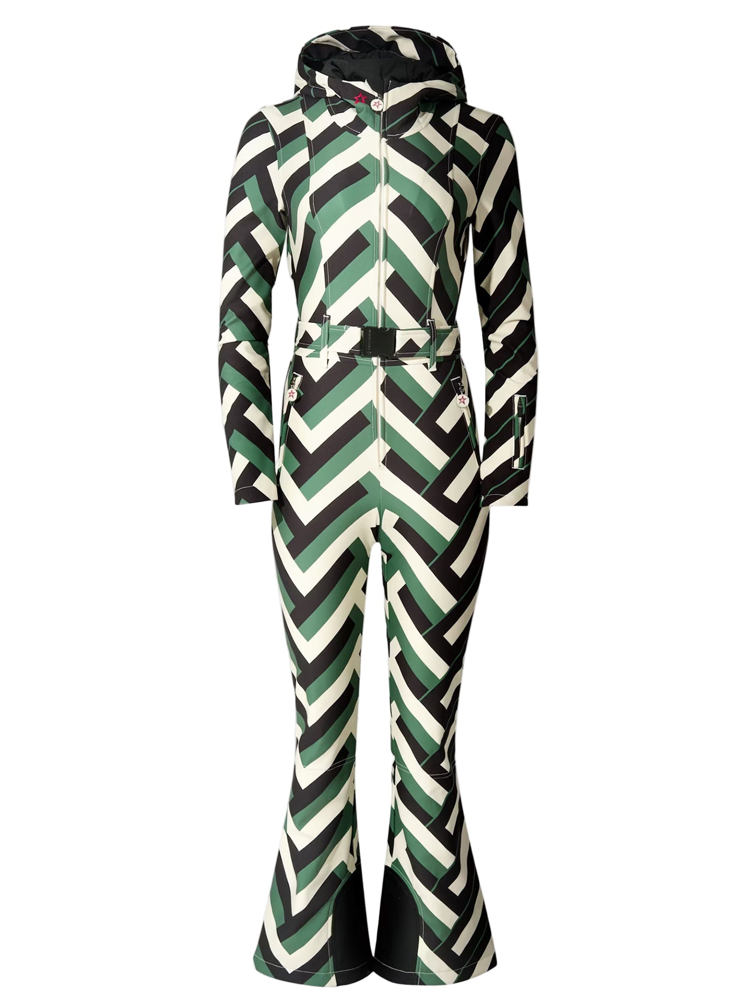 Engineered for performance and style, the Tignes Chevron Ski Suit is crafted from four-way stretch fabric with a thermal fleece lining for warmth and unrestricted movement. Water-resistant and breathable, it features a helmet-compatible hood, zippered pockets including a sleeve ski pass pocket, and snow gaiters for full coverage. Finished with a detachable belt, this suit delivers sleek functionality and a refined, modern silhouette.