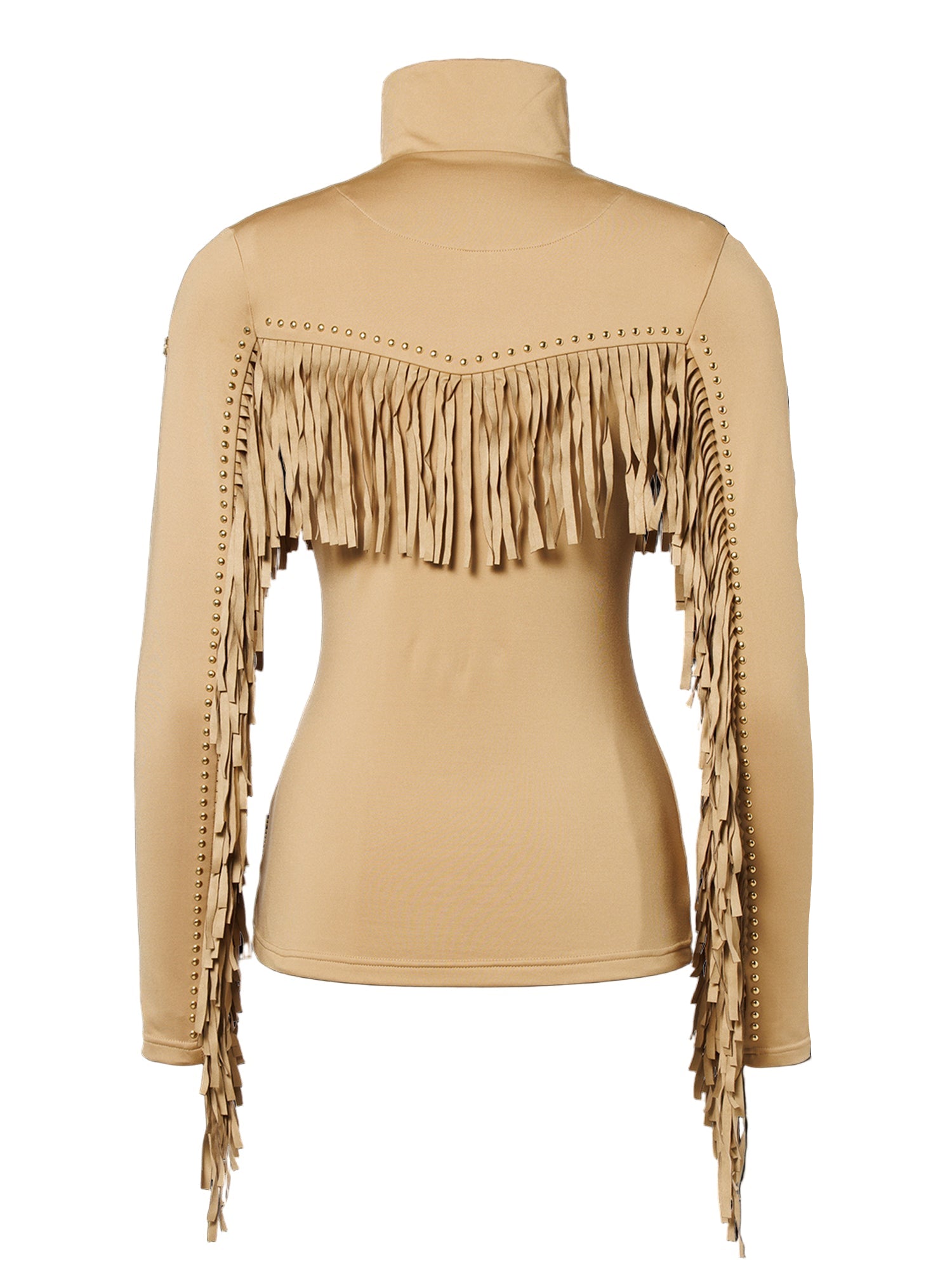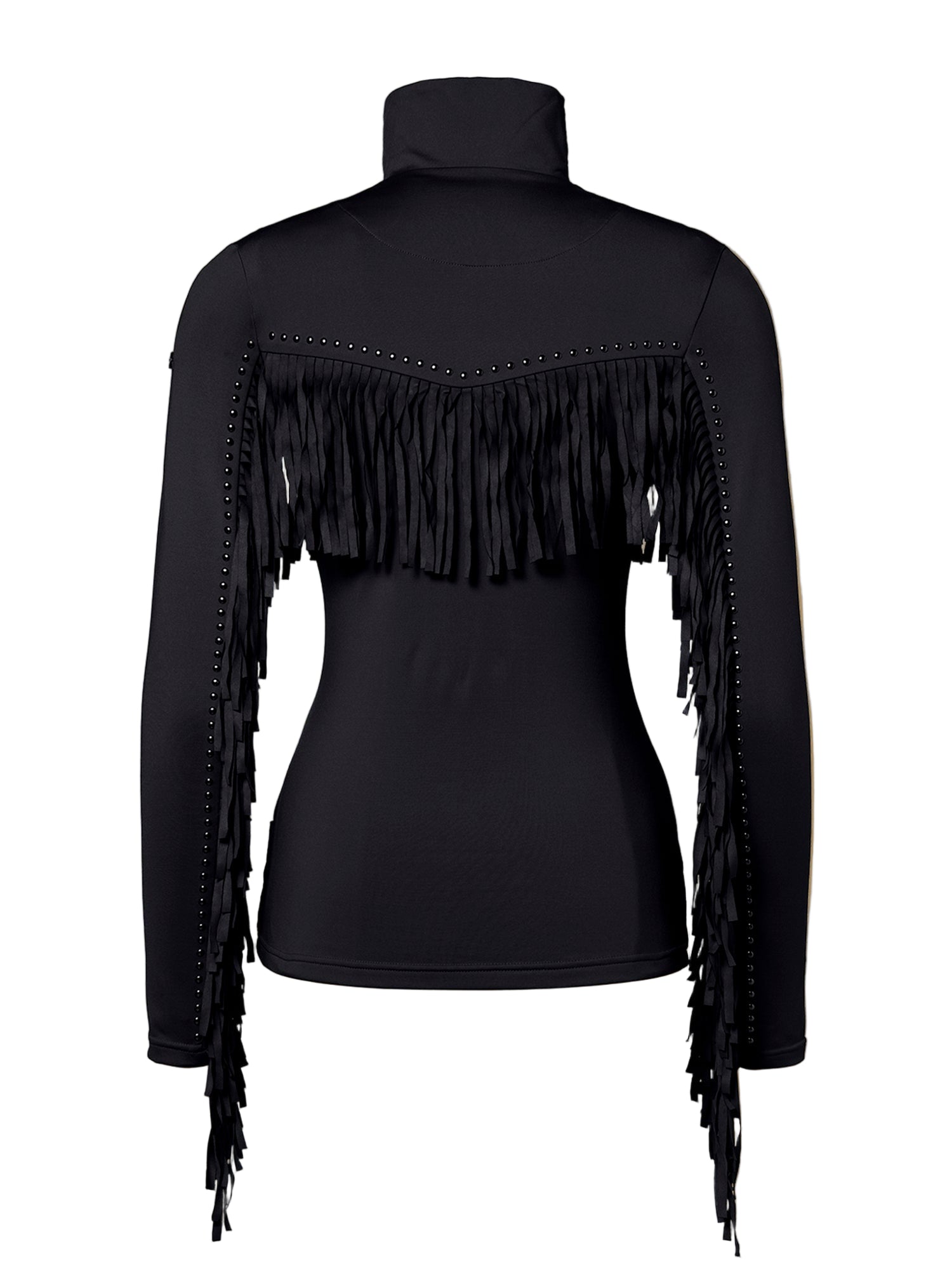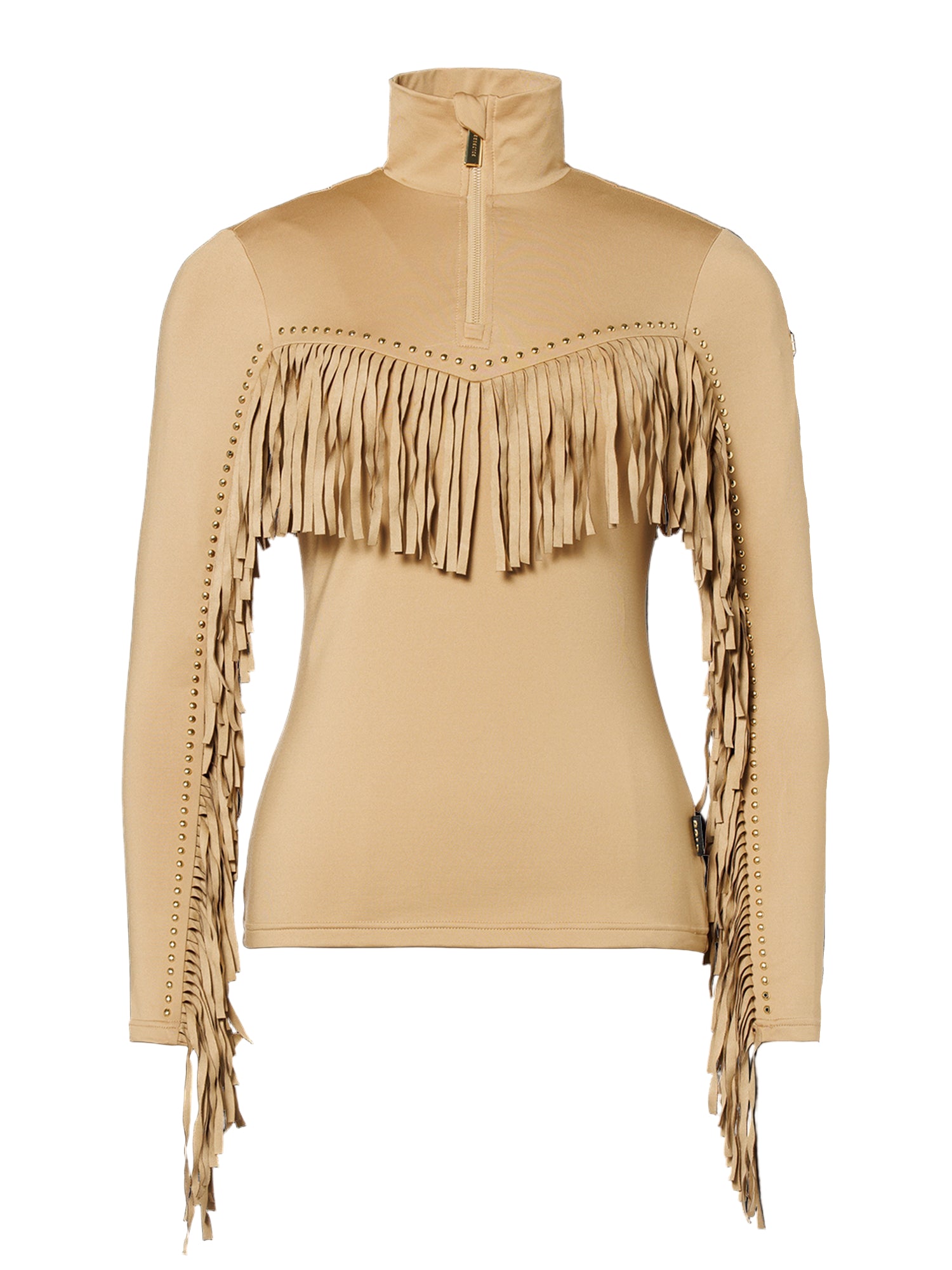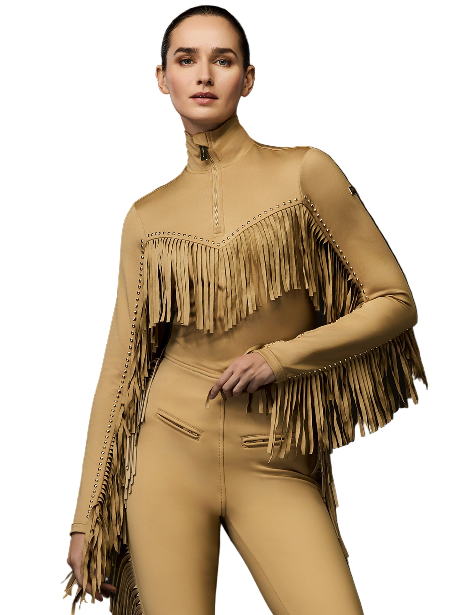 Exclusive to Gorsuch as part of the Goldbergh Gold collection, the Whisper Fringe Turtleneck reimagines alpine style with a bold, western-inspired twist. Crafted from Powerstretch fabric with a soft brushed interior, it offers warmth, flexibility, and sleek comfort. Long, dramatic fringe cascades across the chest and down the sleeves for dynamic movement, while a quarter‑zip with chin guard adds a technical finish. A standout base layer designed to turn heads from the slopes to après-ski.