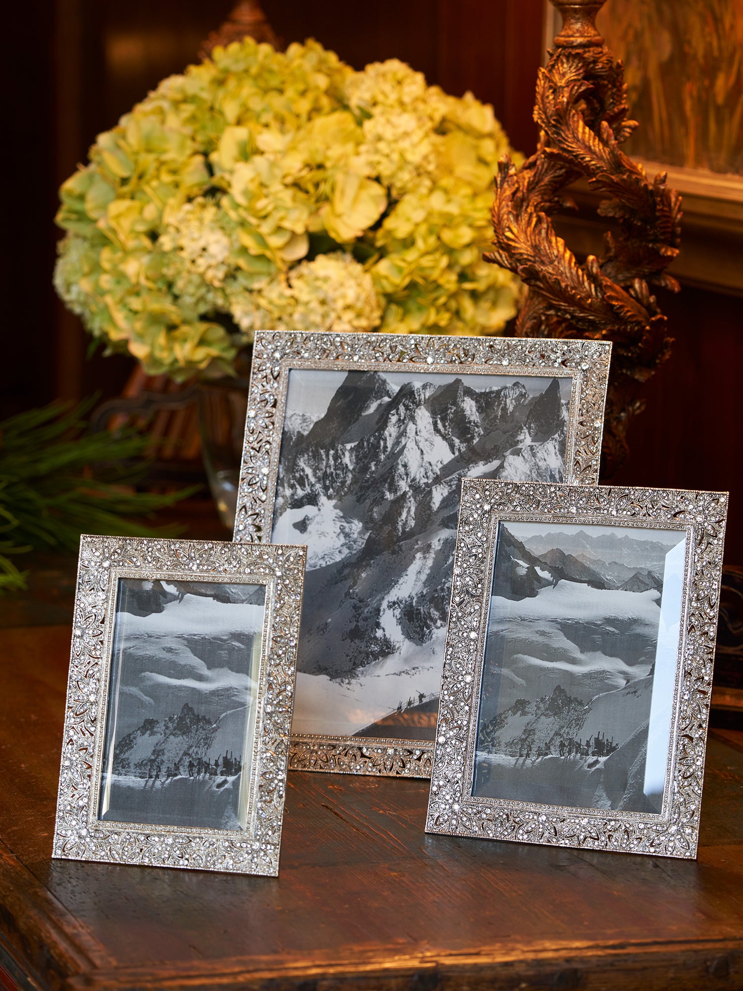 • hand-set clear swarovski crystal pavé clusters